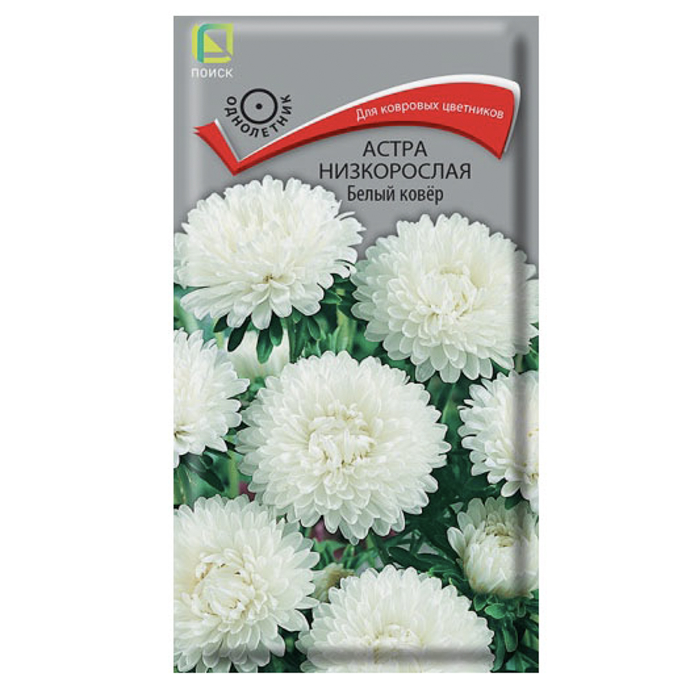 Семена астры однолетней сорта «Белый ковер» предназначены для выращивания великолепного низкорослого сорта, предназначенного для создания ковровых цветников. Растение компактное, высотой 20–25 см, с большим количеством боковых побегов. Соцветия белые, диаметром 6–7 см. Цветение обильное, продолжается с июля до заморозков. Используется в сборных цветниках, на рабатках, для бордюров и мини-букетов. Растение предпочитает открытое солнечное место, но может расти и в полутени. Лучше развивается на лёгких, плодородных почвах. Не переносит внесения органических удобрений в год посева. Семена высевают с середины февраля по апрель; глубина заделки — 0,5 см. Всходы появляются при температуре +20°C через 7–14 дней. Через 3–4 недели сеянцы пикируют и выращивают при температуре 12–15°C. В открытый грунт рассаду высаживают во второй половине мая, соблюдая расстояние между растениями 20 см. Вес семян в упаковке — 0,2 г (±9%).