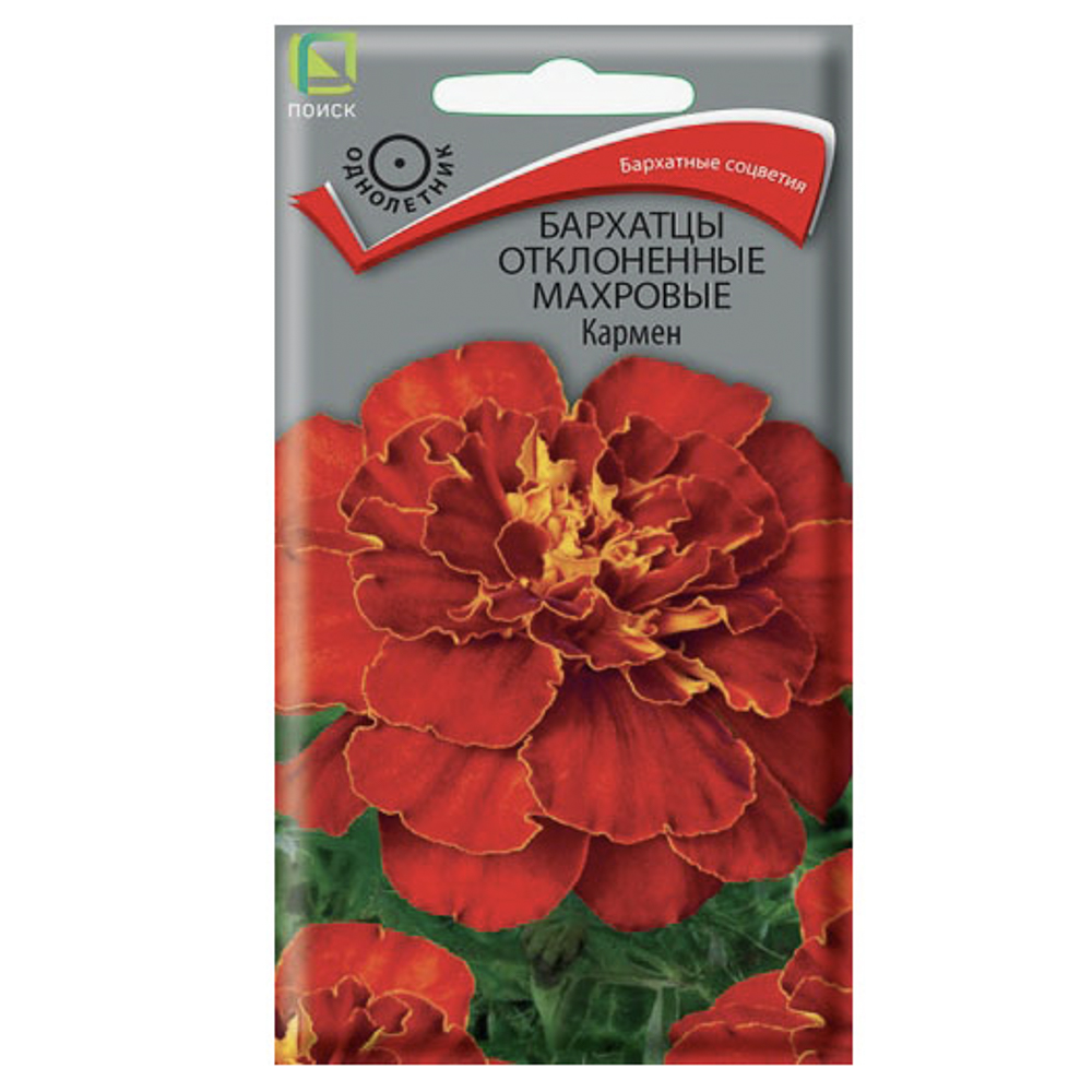 Семена бархатцев отклоненных махровых сорта «Кармен» предназначены для выращивания однолетнего растения с компактным, густооблиственным кустом высотой до 30 см. Соцветия гвоздиковидные, махровые, диаметром 5 см, язычковые цветки коричнево-красные с жёлтым пятном у основания. Цветение продолжается с июня по сентябрь. Используется для оформления клумб, рабаток, бордюров и создания декоративных пятен. Растение светолюбивое, засухоустойчивое, предпочитает плодородные и солнечные места (может расти и при небольшом затенении). Размножают посевом семян в марте–апреле в рассадные ящики на глубину 0,5–1 см. Всходы появляются при температуре почвы +18°C через 7–15 дней. Сеянцы пикируют в фазе двух настоящих листьев. В открытый грунт рассаду высаживают в конце мая — начале июня, соблюдая расстояние между растениями 25–30 см. Вес семян в упаковке — 0,4 г (±9%).