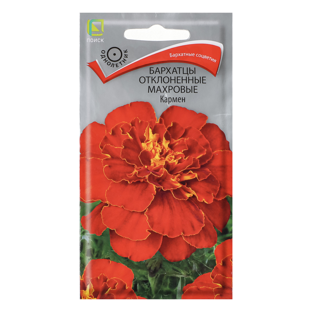 Семена бархатцев отклоненных махровых сорта «Кармен» предназначены для выращивания однолетнего растения с компактным, густооблиственным кустом высотой до 30 см. Соцветия гвоздиковидные, махровые, диаметром 5 см, язычковые цветки коричнево-красные с жёлтым пятном у основания. Цветение продолжается с июня по сентябрь. Используется для оформления клумб, рабаток, бордюров и создания декоративных пятен. Растение светолюбивое, засухоустойчивое, предпочитает плодородные и солнечные места (может расти и при небольшом затенении). Размножают посевом семян в марте–апреле в рассадные ящики на глубину 0,5–1 см. Всходы появляются при температуре почвы +18°C через 7–15 дней. Сеянцы пикируют в фазе двух настоящих листьев. В открытый грунт рассаду высаживают в конце мая — начале июня, соблюдая расстояние между растениями 25–30 см. Вес семян в упаковке — 0,4 г (±9%).