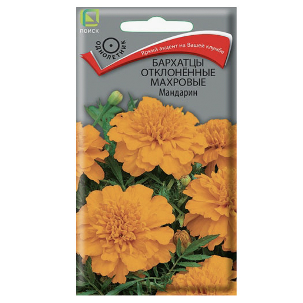 Семена бархатцев отклоненных махровых сорта «Мандарин» предназначены для выращивания однолетнего растения с броскими яркими соцветиями. Куст шаровидный, густоветвистый, высотой 30 см. Соцветия гвоздиковидные, махровые, тёмно-оранжевые, диаметром 5 см. Цветение продолжается с июня по октябрь. Используется для оформления клумб, рабаток, бордюров и украшения балконов. Растение теплолюбивое, засухоустойчивое, предпочитает солнечное место и любую почву, хорошо дренированную. Семена высевают в апреле–мае в рассадные ящики на глубину 0,5–1 см. Всходы появляются при температуре почвы +18°C через 7–15 дней. Через две недели сеянцы пикируют. В открытый грунт рассаду высаживают после окончания весенних заморозков, соблюдая расстояние между растениями 20–30 см. Вес семян в упаковке — 0,4 г (±9%).