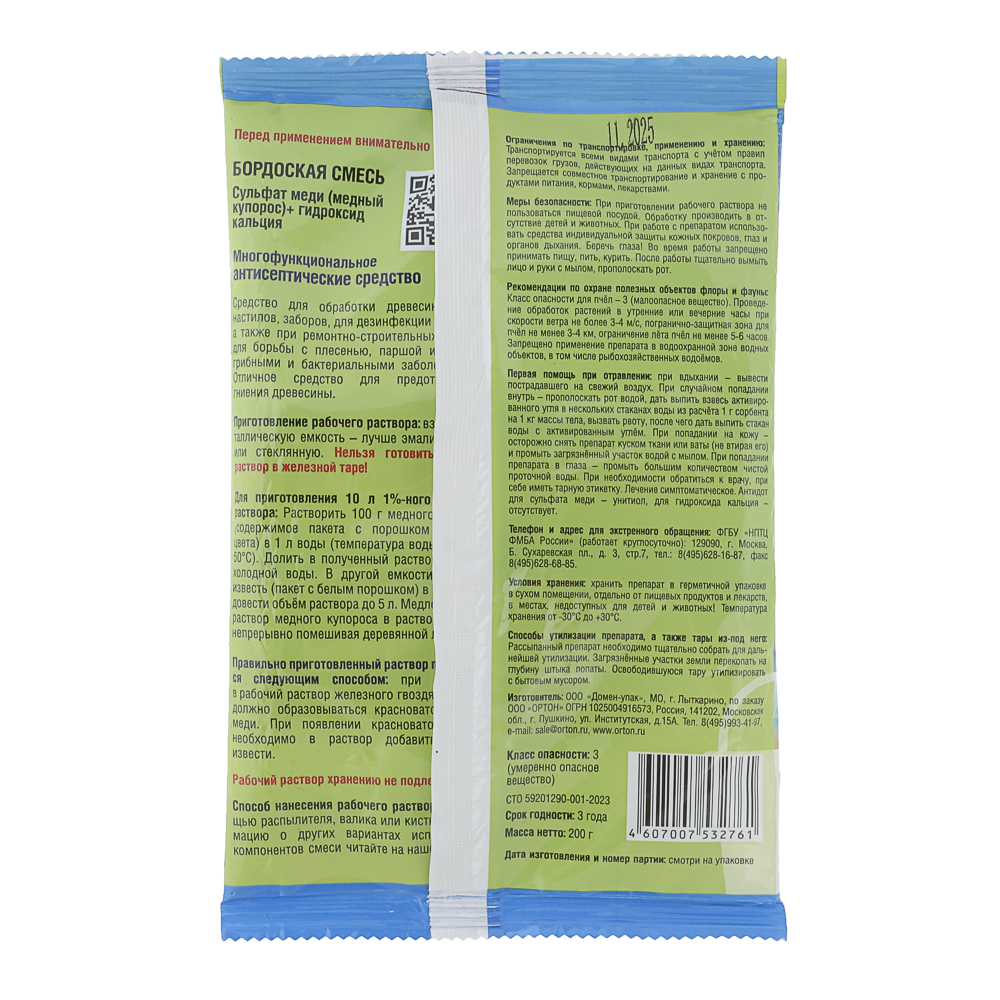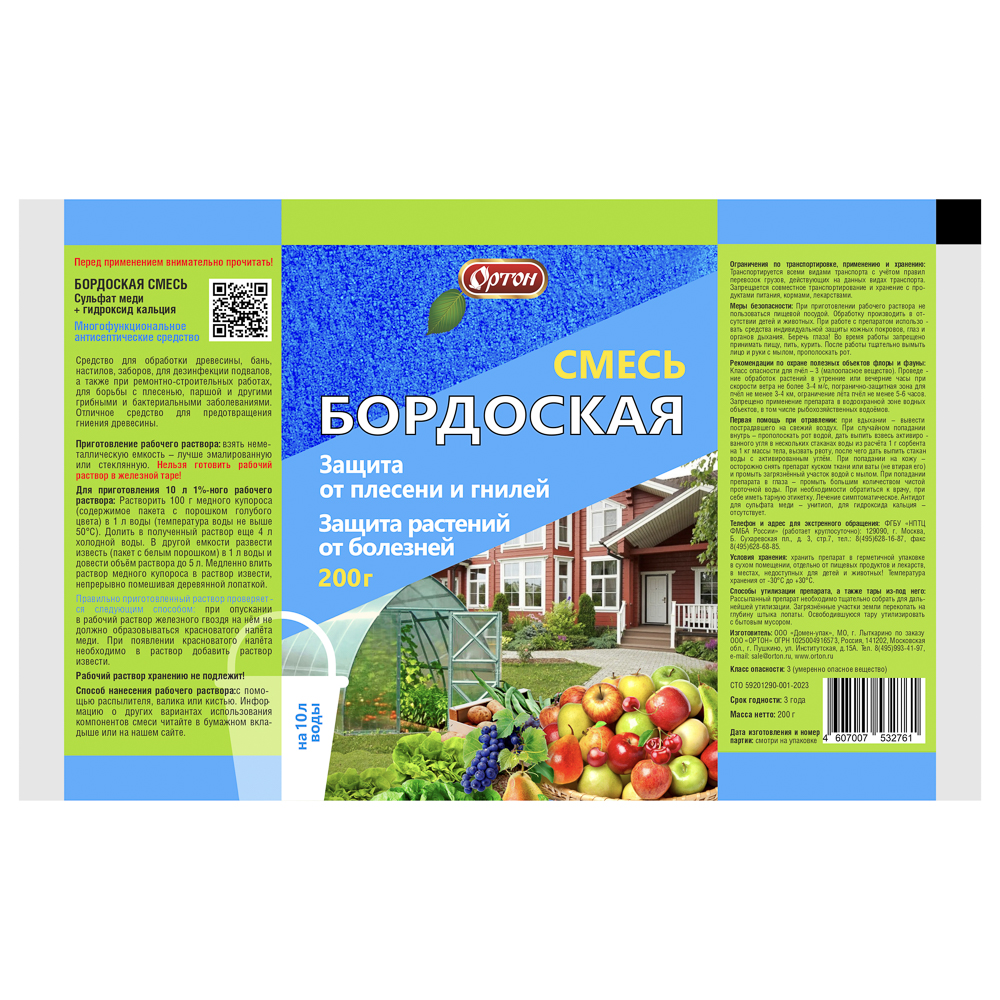 Бордоская смесь Ортон, 200 г – это проверенное и надежное средство для защиты растений от грибковых болезней. Это классическое фунгицидное средство на основе сульфата меди и гидроксида кальция, которое эффективно борется с такими распространенными заболеваниями, как: мучнистая роса, плесень и гнили, парша у яблонь и груш, фитофтороз картофеля и томатов, ржавчина и пятнистости листьев. Идеально подходит для обработки плодовых деревьев, ягодников, овощных культур (особенно томатов, картофеля, огурцов), а также декоративных растений и цветов. Также используется для дезинфекции древесины, бань, садовых инструментов и даже для профилактики плесени в помещениях. Готовый раствор нужно использовать сразу – он не хранится!