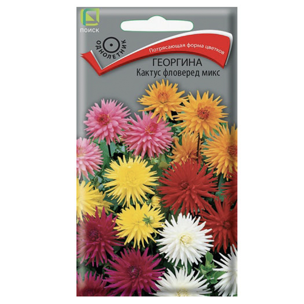 Семена георгин сорта «Кактус фловеред микс» предназначены для выращивания однолетнего растения с яркой смесью кактусовидных цветов. Растение высотой около 130 см, соцветия крупные, диаметром 7–10 см, самых разнообразных оттенков. Цветение продолжается с июля по октябрь. Используется в цветниках, большими группами на клумбах. Является прекрасным материалом для срезки. Растение любит обильный полив и подкормки. Посев семян проводят в марте в рассадные ящики на глубину 0,3–0,5 см. Всходы появляются при температуре почвы +18°C через 7–14 дней. Сеянцы пикируют в горшки. В открытый грунт рассаду высаживают после окончания весенних заморозков (в конце мая), соблюдая расстояние между растениями 30–50 см. Вес семян в упаковке — 0,2 г (±9%).