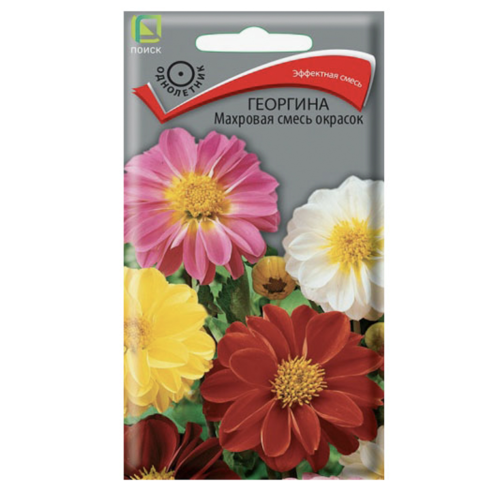 Семена георгин махровых смеси окрасок предназначены для выращивания однолетнего растения с эффективными махровыми цветами разнообразной окраски. Растение высотой 50–60 см, соцветия диаметром 8–9 см, язычковые цветки широкие, плоские. Цветение обильное, продолжается в течение всего лета. Используется в цветниках большими группами, на бордюрах и рабатках. Растение предпочитает солнечное место, к почвам нетребовательно. Посев семян проводят в марте–апреле в рассадные ящики на глубину 0,5 см. Всходы появляются при температуре почвы +18°C через 7–14 дней. Сеянцы пикируют в горшки по 2–3 штуки, содержат при умеренной температуре. В открытый грунт рассаду высаживают в конце мая — начале июня, соблюдая расстояние между растениями 30–40 см. Вес семян в упаковке — 0,3 г (±9%).