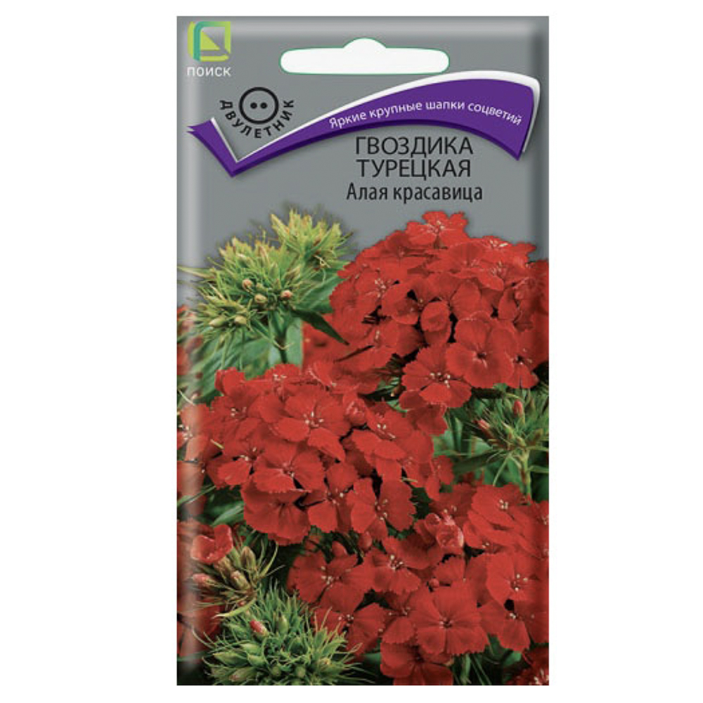 Семена гвоздики турецкой (бородатой) сорта «Алая красавица» предназначены для выращивания двулетнего растения. Куст высотой 50 см, листья линейно-ланцетные, зелёные. К концу первого года выращивания формируется розетка прикорневых листьев; цветение наступает на следующий год — с конца июня в течение месяца. Цветки ярко-красные, привлекательные. Используется для оформления сборных цветников, рабаток и срезки. Растение холодо- и засухоустойчивое, предпочитает солнечные места, но может расти и в полутени. Лучше развивается на плодородных дренированных почвах. Посев семян проводят в мае–июне в открытый грунт на разводочные гряды, слегка присыпая их влажным песком. Всходы появляются при температуре почвы +18–20°C через 10–14 дней. На постоянное место рассаду высаживают в августе, соблюдая расстояние между растениями 25–30 см. Возможно размножение отводками весной и осенью. Вес семян в упаковке — 0,5 г (±9%).