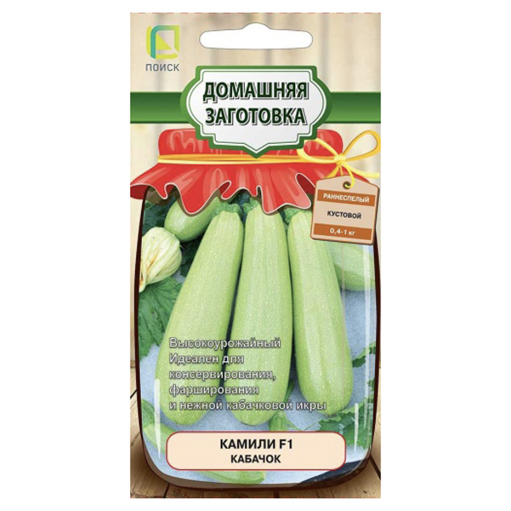 Семена кабачка гибрида «Камили F1» предназначены для выращивания раннеспелого сорта. Растение кустовой формы, компактное. Период от всходов до начала плодоношения составляет 50–60 дней. Плод цилиндрический, светло-зелёный, созревание дружное. Масса товарного плода — 0,4–1 кг. Мякоть светло-зелёной окраски, плотная, нежная, сочная, вкус отличный. Гибрид универсального использования — подходит как для свежего потребления, так и для консервирования; для последнего рекомендуется использовать молодые плоды длиной 10–12 см. Сроки посева — с 25 апреля по 15 мая, глубина заделки семян — 2–3 см. Высадка рассады в открытый грунт — с 20 мая по 10 июня. Сбор урожая — с 20 июня по 20 августа. Схема посадки — 70х70 см. Сроки указаны для средней полосы России. Количество семян в упаковке — 12 штук.