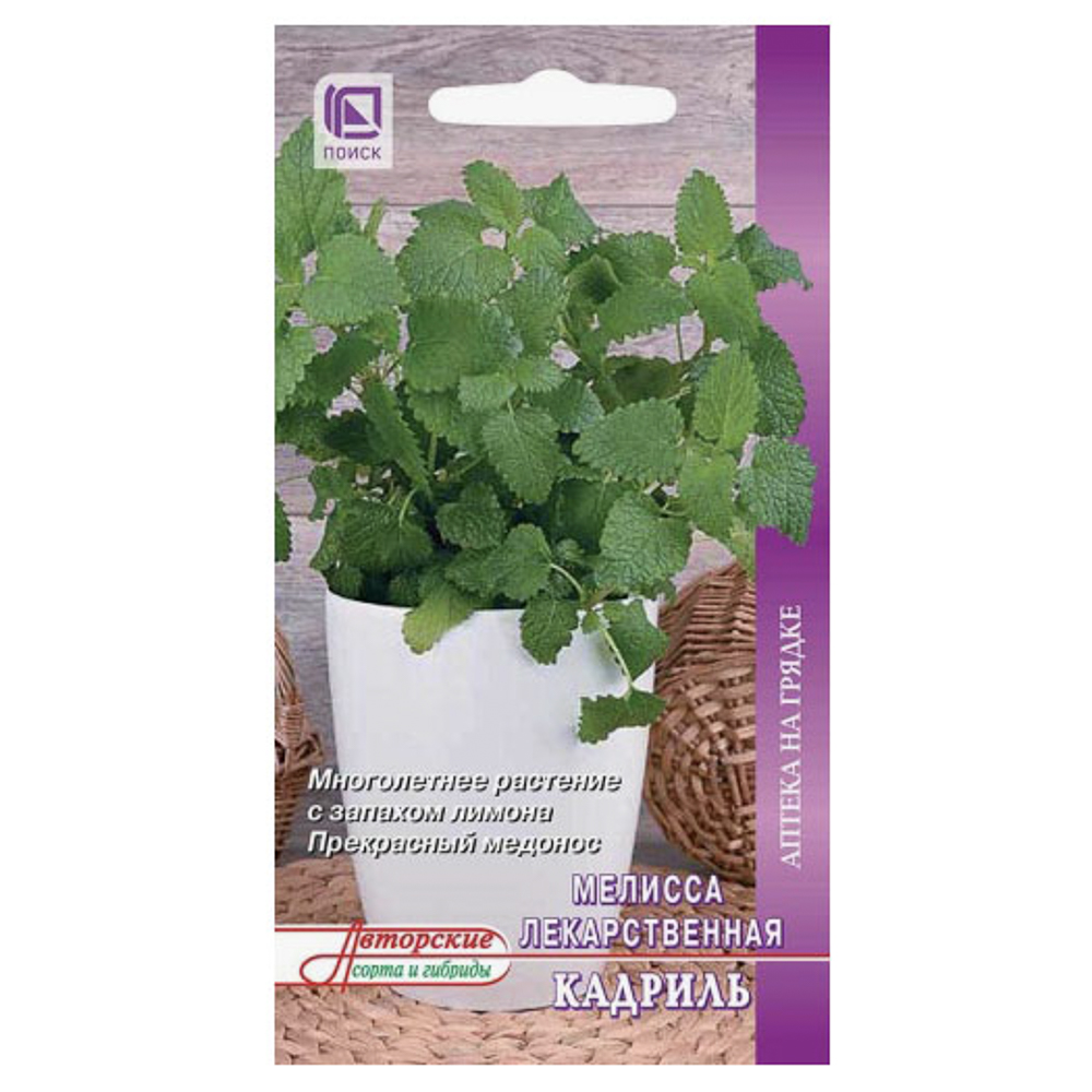 Семена мелиссы лекарственной сорта «Кадриль» предназначены для выращивания многолетнего тонизирующего растения с характерным запахом лимона. Высота растения — до 80 см, листья тёмно-зелёные. Растение относительно холодостойкое, предпочитает плодородные и умеренно увлажнённые почвы. Обладает приятным лимонным ароматом и горьковато-пряным вкусом. Используется в кулинарии для ароматизации чая, добавляется при солении овощей. В народной медицине настой применяют как успокаивающее средство при бессоннице, невралгии, астме, малокровии, а также как потогонное и слабительное. Сроки посева — с 25 марта по 10 апреля, глубина заделки семян — 0,5–1 см. Высадка рассады в открытый грунт — с 15 по 30 мая. Сбор урожая — с 15 июня по 30 августа. Схема посадки — 35х20–25 см. Сроки указаны для средней полосы России. Вес семян в упаковке — 0,5 г (±9%).