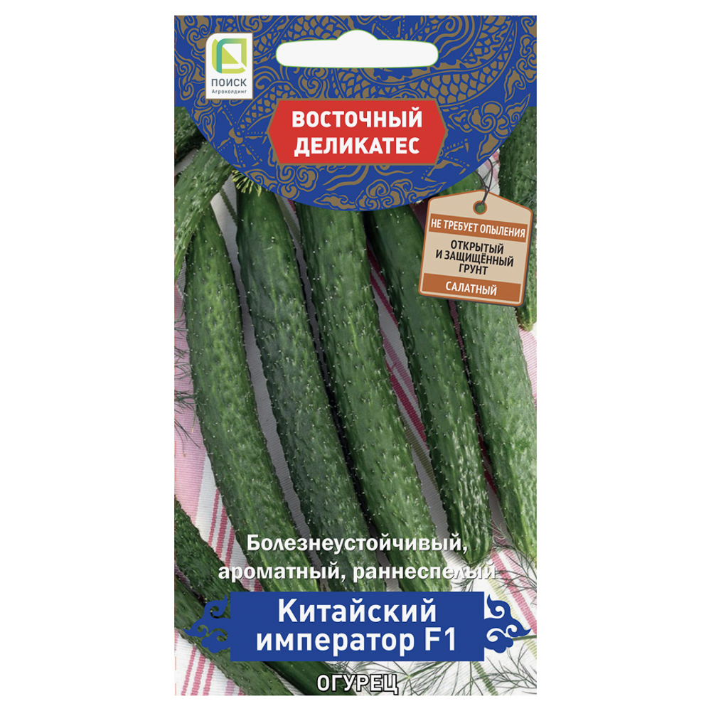 Семена огурца гибрида «Китайский император F1» предназначены для выращивания партенокарпического раннеспелого гибрида, пригодного для открытого и защищённого грунта. Период от всходов до сбора урожая составляет 42–45 дней. Плод удлиненно-цилиндрический, длиной 37–40 см, диаметром 5,0–5,5 см, массой 350–400 г, равномерной темно-зелёной окраски, блестящий, крупнобугорчатый, белошипый. Гибрид устойчив к мучнистой росе, пероноспорозу, фузариозу и высоким температурам. Предназначен для употребления в свежем виде и в салатах. Сроки посева — с 5 по 15 мая, глубина заделки семян — 1,5–2,0 см. Высадка рассады — без указания на упаковке (обычно не применяется, так как огурцы чаще выращивают прямым посевом или с использованием рассады в защищённом грунте). Сбор урожая — с 23 июня по 31 августа. Схема посадки — 70х40 см. Сроки указаны для средней полосы России. Количество семян в упаковке — 5 штук.
