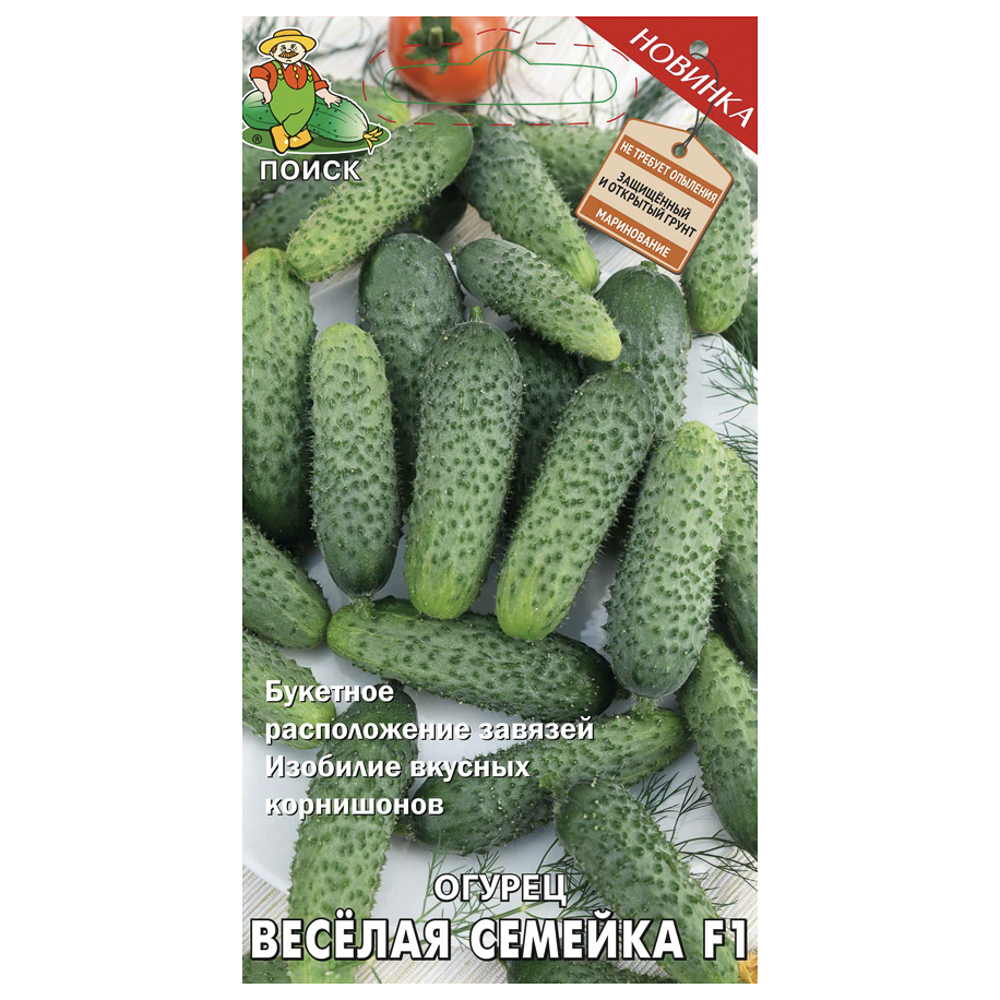 Семена огурца гибрида «Веселая семейка F1» предназначены для выращивания партенокарпического гибрида, устойчивого к резким перепадам температур, пригодного для защищённого и открытого грунта. Период от всходов до плодоношения составляет 38–42 дня. В узле формируется более пяти завязей. Плоды цилиндрической формы, без горечи, длиной 10–12 см, темно-зелёной окраски с короткими полосами, крупнобугорчатые, белошипые. Масса плода — 90–120 г. Устойчив к кладоспориозу, настоящей мучнистой росе, корневым гнилям, вирусу огуречной мозаики. Рекомендован для маринования. Сроки посева — с 10 мая по 10 июня, глубина заделки семян — 1,5–2,0 см. Высадка рассады — без указания на упаковке (обычно не применяется, так как огурцы чаще выращивают прямым посевом или с использованием рассады в защищённом грунте). Сбор урожая — с 20 июня по 30 августа. Схема посадки — 70×30 см. Сроки указаны для средней полосы России. Количество семян в упаковке — 12 штук.