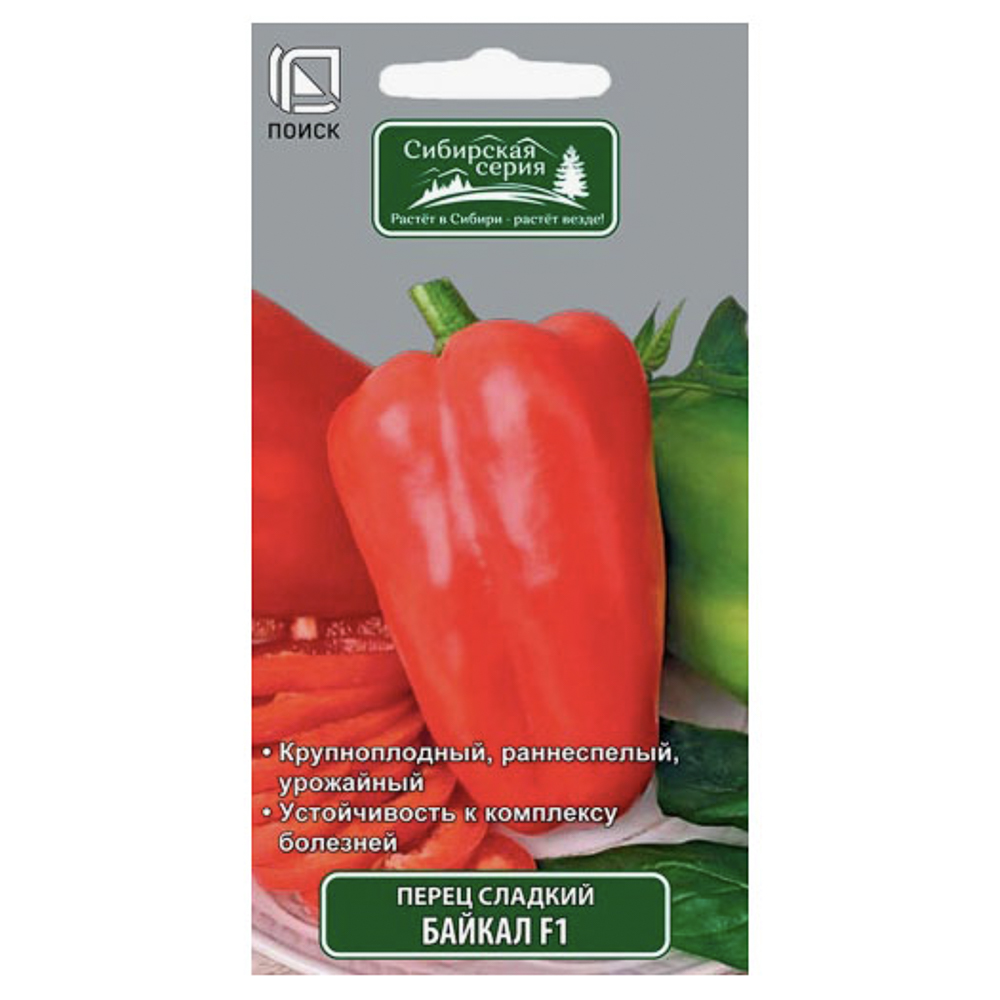 Семена сладкого перца гибрида «Байкал F1» предназначены для выращивания раннеспелого сорта. Период от всходов до начала плодоношения составляет 95–105 дней. Растение мощное, хорошо адаптированное для выращивания как в открытом грунте, так и в защищённом. Плоды удлинённо-конической формы, пониклые, сильноглянцевые, массой 180–220 г, с сочной, ароматной мякотью превосходного вкуса. В технической спелости окраска плодов светло-зелёная, в биологической — ярко-красная. Гибрид устойчив к вирусу табачной мозаики, вертициллёзному и фузариозному увяданию. Подходит для различной кулинарной переработки и незаменим для свежего употребления. Сроки посева — с 10 по 20 марта, глубина заделки семян — 1,5 см. Высадка рассады в открытый грунт — с 20 по 30 мая. Начало сбора урожая — с 1 по 30 августа. Расстояние между растениями — 50 см, высота растения — до 60 см. Сроки указаны для средней полосы России. Количество семян в упаковке — 12 штук.