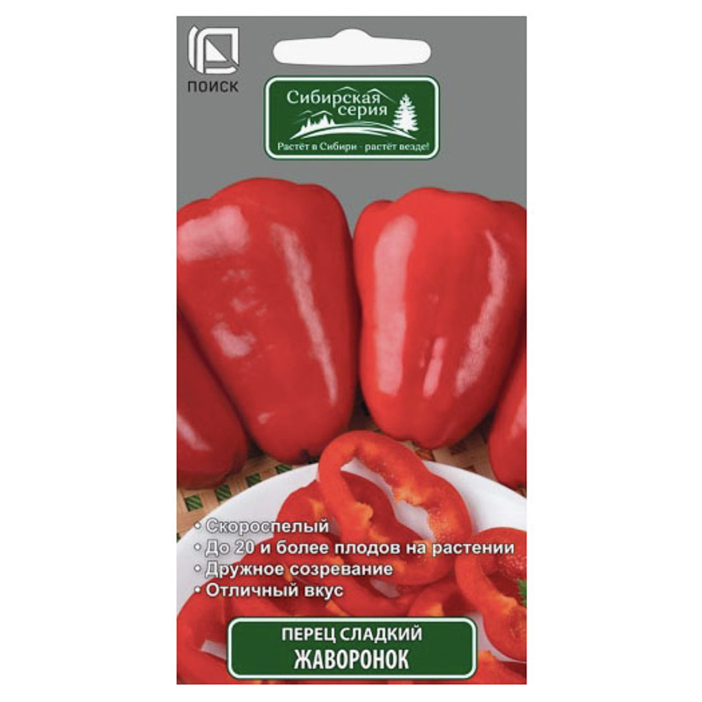 Семена сладкого перца сорта «Жаворонок» предназначены для выращивания раннеспелого высокоурожайного сорта. Период от всходов до начала созревания составляет 90–105 дней. Растение компактное, среднерослое, на одном растении формируется до 20 плодов и более. Подходит для открытого грунта и плёночных теплиц. Плод конусовидной формы, глянцевый, в технической спелости — светло-зелёный, в биологической — красный. Масса плода — 90–100 г, толщина стенки — 4,5–5,5 мм. Великолепно подходит для потребления в свежем виде, фарширования и консервирования. Сроки посева — с 10 по 20 марта, глубина заделки семян — 1–1,5 см. Высадка рассады — с 15 по 30 мая. Сбор урожая — с 1 июля по 30 августа. Схема посадки — 40×60 см. Вес семян в упаковке — 0,25 г (±9%).