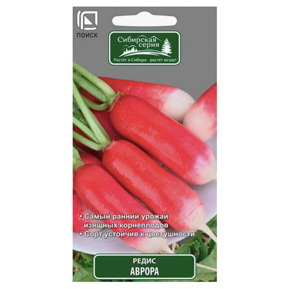 Семена редиса сорта «Аврора» предназначены для выращивания раннеспелого сорта с корнеплодами «один в один». Период от всходов до сбора корнеплодов составляет 17-20 дней. Корнеплоды ровные, цилиндрические, верхняя часть ярко-розовая, массой 16–18 г. Мякоть белая, плотная, приятного слабоострого вкуса. Сорт устойчив к цветушности, пригоден для одноразового сбора. Сроки посева — с 25 апреля по 20 мая и с 1 по 30 августа, глубина заделки семян — 1,5-2 см. Сбор урожая — с 25 мая по 1 июля и с 1 по 20 сентября. Схема посадки — 3х15-20 см. Сроки указаны для средней полосы России. Вес семян в упаковке — 3 г (±9%).