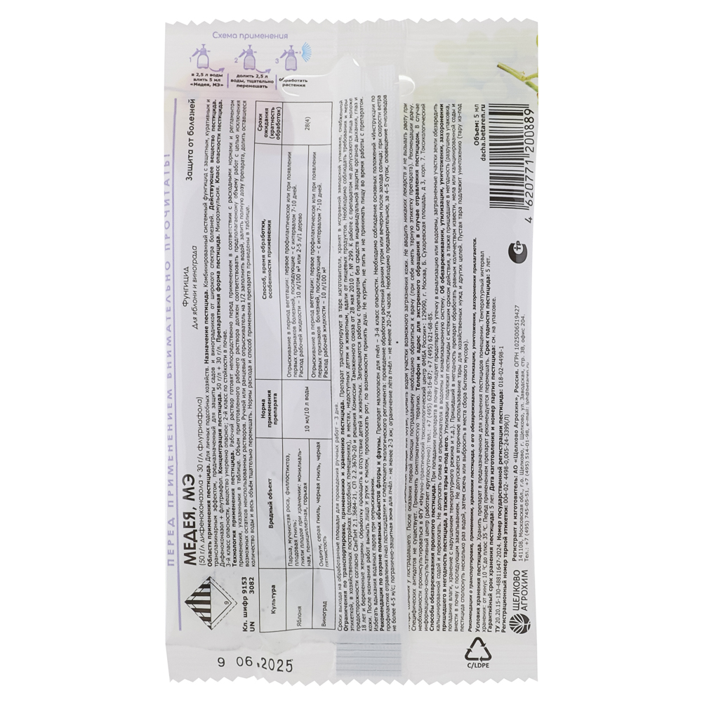 Медея – ваш надёжный щит для сада и виноградника. Всего 5 мл средства защитят до 50 м2 или 1-3 дерева от грибковых болезней. Средство лечит уже поражённые растения, останавливая распространение инфекции. Работает быстро – эффект заметен уже через несколько дней. Не смывается дождём, защищает на протяжении нескольких недель. Безопасен для растений при правильном применении, не вызывает ожогов, не влияет на вкус плодов. Более того, помогает продлить срок хранения урожая. Идеален для тех, кто хочет сохранить урожай без лишних хлопот. Просто разведите в воде и опрыскайте, и ваши яблони, виноградники, кустарники будут здоровыми и красивыми.