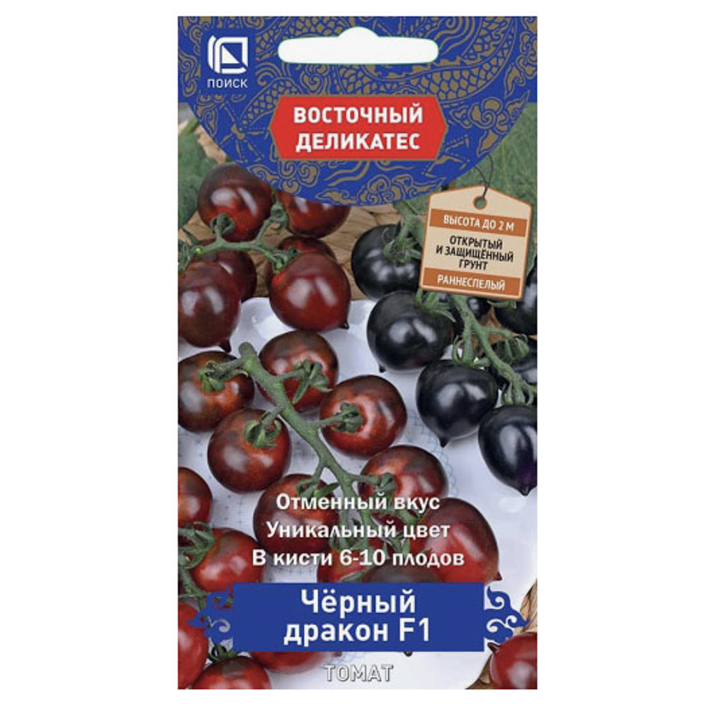 Семена томата гибрида «Чёрный дракон F1» предназначены для выращивания раннеспелого сорта с уникальной окраской плодов. Период от всходов до начала созревания составляет 100–105 дней. Растение компактное, с укороченными междоузлиями и голубовато-зелёной листвой. Плоды округлые, с небольшим острым носиком, гладкие, плотные, массой 27–30 г. Окраска незрелого плода — тёмно-фиолетовая с зелёным пятном, зрелого — красно-коричневая. Обладает насыщенным тонким ароматом, хорошим вкусом и высоким содержанием ликопина и антоцианов. Рекомендован для консервирования, вяления, обладает высокими декоративными качествами. Сроки посева — с 10 по 20 марта, глубина заделки семян — 1–1,5 см. Высадка рассады в открытый грунт — с 10 по 20 мая. Сбор урожая — с 25 июня по 31 августа. Схема посадки — 40-50х70 см. Сроки указаны для средней полосы России. Количество семян в упаковке — 10 штук.