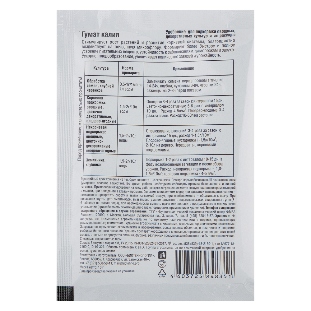Удобрение, Гумат Калия, с микроэлементами повышает всхожесть и прорастание семян 30-50%. Обеспечивает экологически чистый урожай, богатый витаминами и питательными веществами. Улучшает структуру почвы и повышает урожайность на 20-30%. Перед применением внимательно ознакомьтесь с инструкцией на упаковке.Применение гумата калия в сельском хозяйстве позволит вам: - Повысить качество сельскохозяйственной продукции (клейковина, сахаристость, витамин С в овощах); - Усилить иммунитет у растений; - Повысить морозо- и засухоустойчивость за счет увеличения корневой системы растений; - Увеличить эффективность обработки семенного материала совместно с протравителями (повышается полевая всхожесть семян, усиливается подавление патогенов, повышается иммунитет растений); - Повысить эффективность применения минеральных удобрений (растет коэффициент использования азота, фосфора, калия).