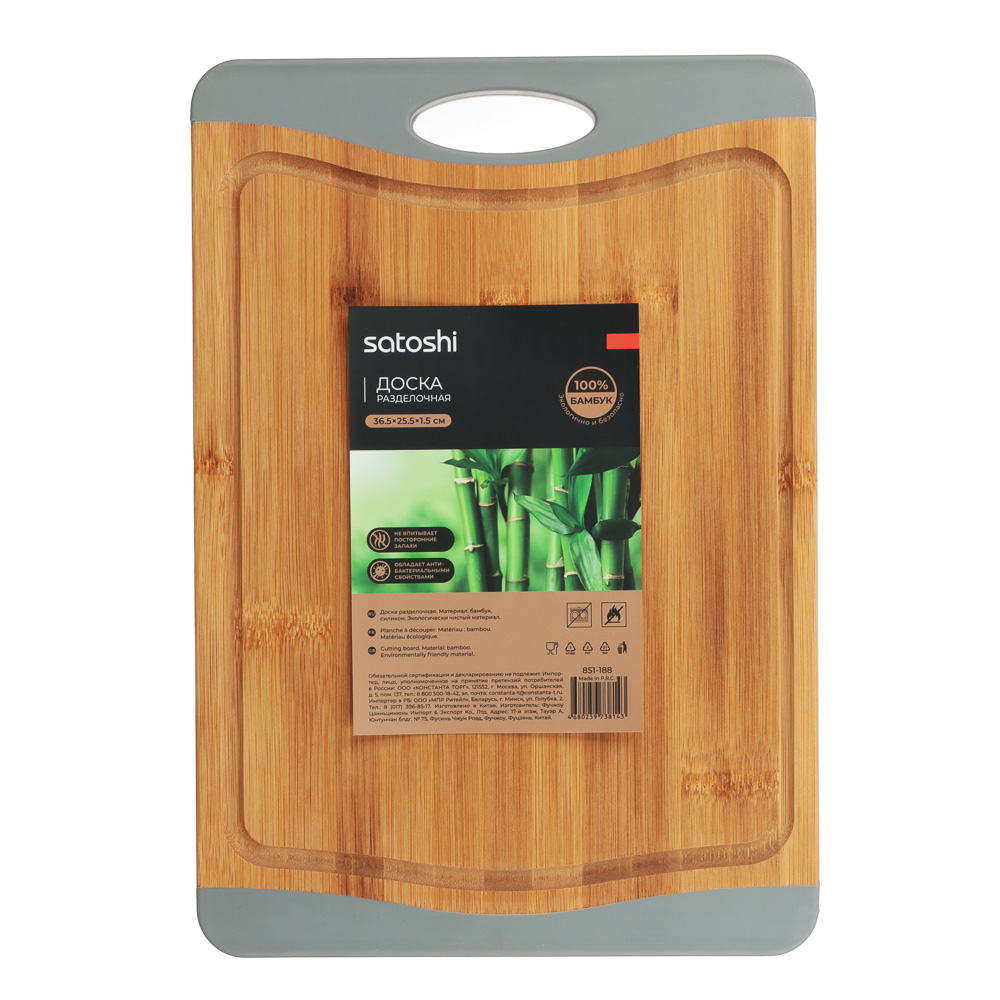 Разделочная доска является необходимым атрибутом любой кухни. Доски из бамбука фирмы Satoshi отличаются повышенной износостойкостью. Благодаря силиконовым уголкам доска будет устойчиво держаться на любой поверхности. После использования помыть в теплой воде и хорошо вытереть. Не помещайте доску в посудомоечную машину. Интересный дизайн украсит вашу кухню.