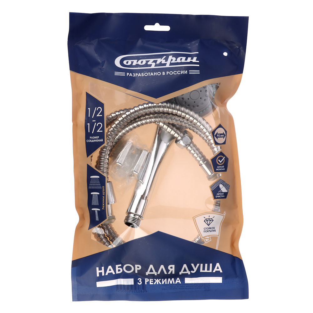 Набор для душа СоюзКран включает лейку диаметром 95 мм с 3 режимами, позволяющими выбрать удобный напор воды. Шланг длиной 150 см обеспечивает достаточную маневренность, а универсальная резьба позволяет легко подключить его к большинству смесителей. Держатель для душа имеет две позиции, что позволяет регулировать угол наклона лейки для большего комфорта. Набор сочетает удобство, практичность и легкость монтажа, идеально подходя для ежедневного использования.