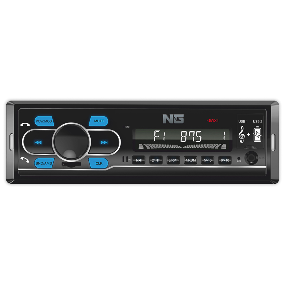 Автомагнитола от NG - воспроизводит музыку с флешки, карты памяти, мобильного телефона, радио. Магнитола с Bluetooth 5.0 и встроенным микрофоном - к ней подключают телефон, чтобы слушать музыку и отвечать на звонки за рулем. Два USB-порта: используйте один для флешки, второй - для подзарядки гаджетов. Разъем для карт памяти microSD. Аудиовход AUX - через него подключают плееры, планшеты и смартфоны. С пультом управления - магнитолой могут управлять пассажиры на заднем сидении. Магнитола на 4 канала - можно подключить 4 динамика в дверях. Пиковая мощность 45 Вт. Размер 1 DIN - без тачскрина.