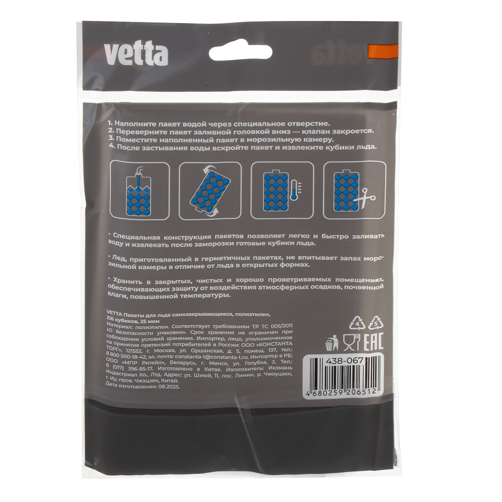 Пакеты для льда VETTA, самозакрывающиеся, изготовлены из прочного полиэтилена толщиной 25 мкм и рассчитаны на 216 кубиков льда. Специальная конструкция с самозакрывающимся клапаном обеспечивает удобство использования: пакеты легко наполнять водой и надежно герметизировать, предотвращая проливание и образование неприятного запаха в морозильной камере.