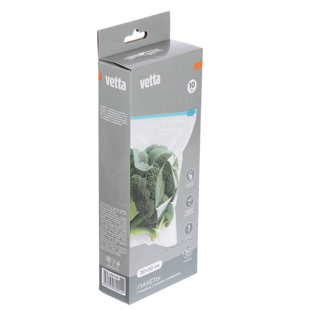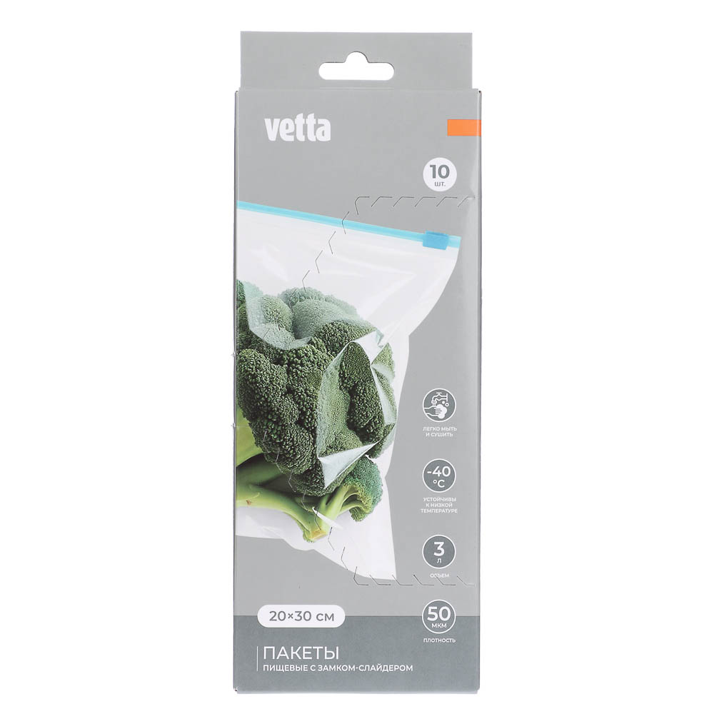 Пакеты с замком-слайдером VETTA идеально подойдут для заморозки и хранения продуктов. Делать заготовки фруктов и овощей теперь станет легче и комфортнее, ведь каждый пакет оснащен удобным замком, который герметично закрывается, а содержимому можно придавать любую форму, экономя место в морозильной камере – разложите продукты компактными пластами, а не в кулек. Пакеты также подходят для хранения сыпучих продуктов и перекусов. Изготовлены из плотного полиэтилена. 10 штук в упаковке.