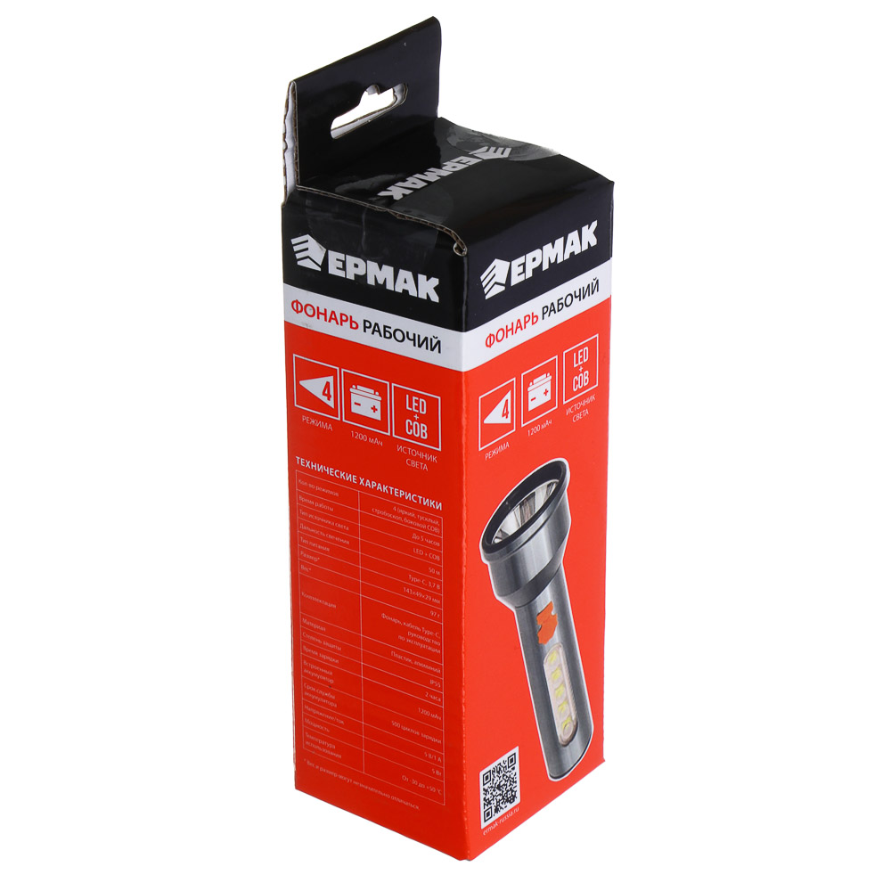 Фонарь рабочий ЕРМАК с LED и COB — универсальное устройство для ремонта, походов или экстренных ситуаций. Четыре режима (яркий, тусклый, стробоскоп, боковой COB-свет) и широкий угол освещения 60° обеспечивают яркий и равномерный свет. Встроенный аккумулятор 1200 мА·ч работает до 5 часов, а зарядка через Type-C — быстрая и удобная. Прочный корпус из алюминия и пластика с защитой IP55 устойчив к пыли, влаге и ударам. Компактный (143×49×29 мм) и эргономичный, он удобен для переноски. В комплекте: фонарь, кабель и руководство. Срок службы — до 3 лет. Надежный помощник в любых условиях.