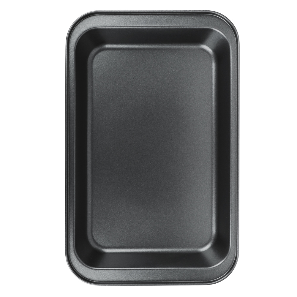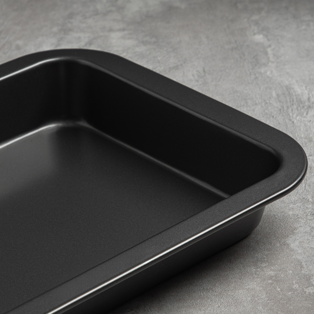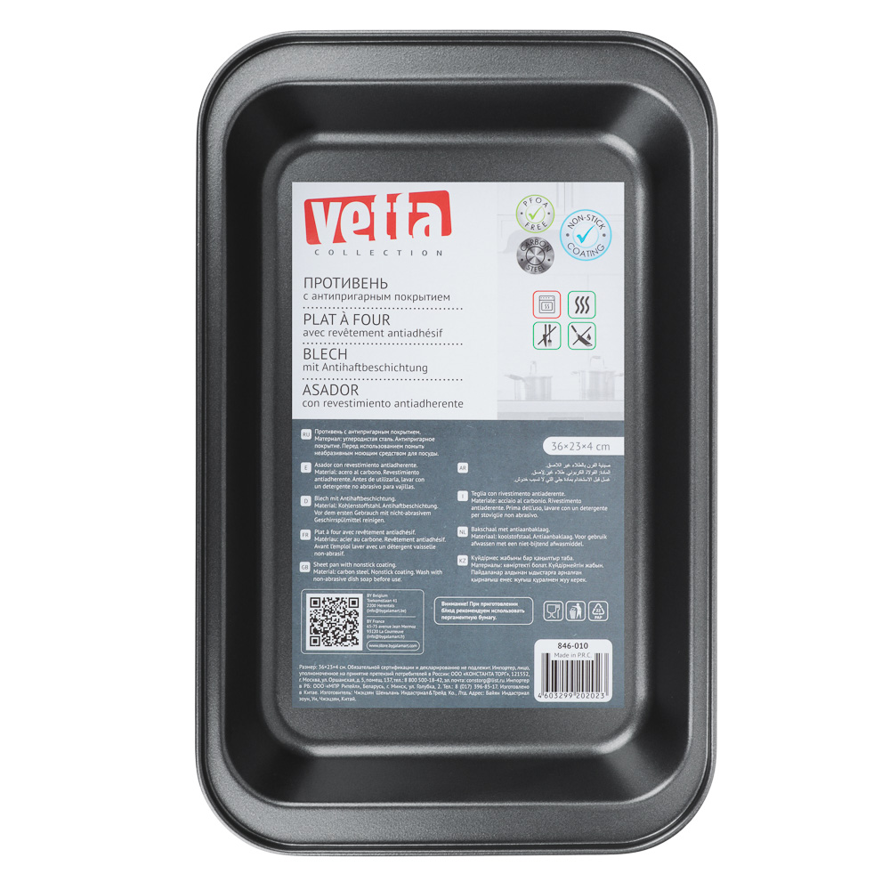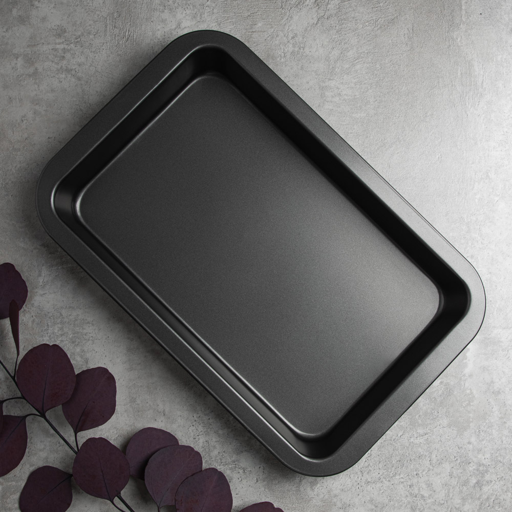 Противень глубокий размерами 36х23х4,5 см из углеродистой стали с 2-х слойным антипригарным покрытием черного цвета предназначен для использования в духовых шкафах.