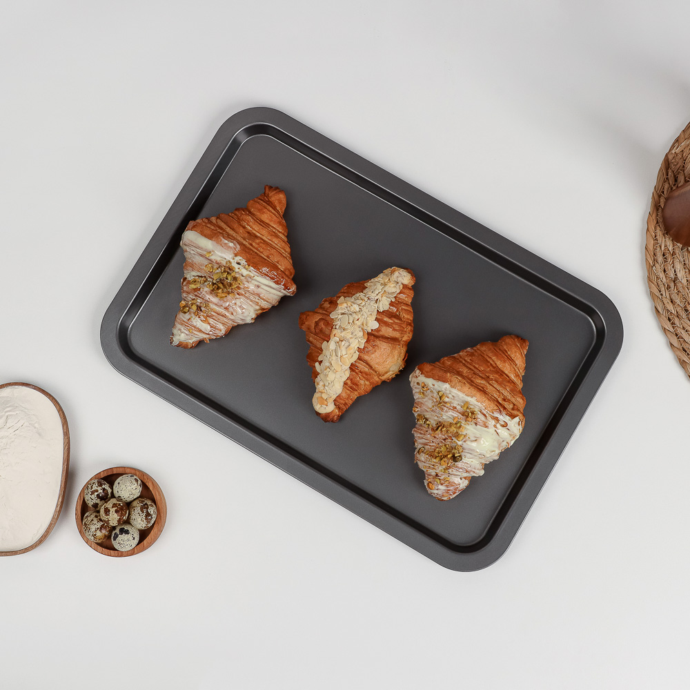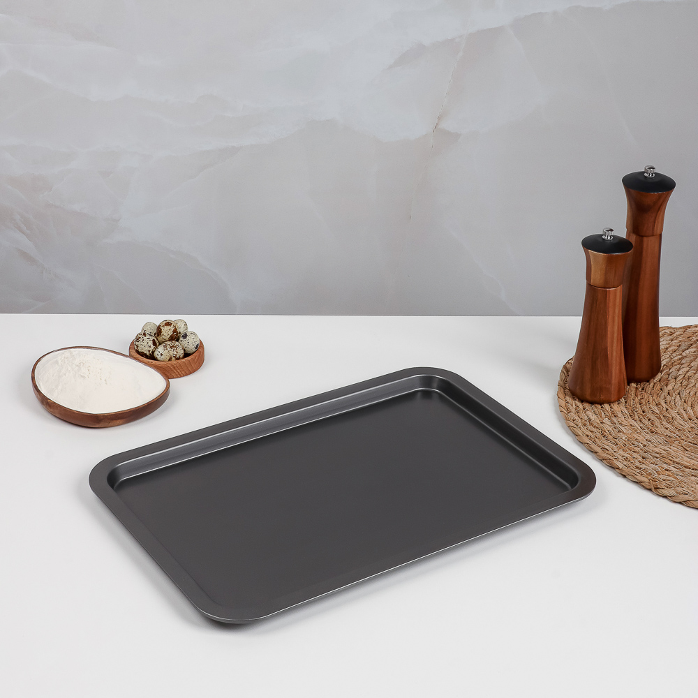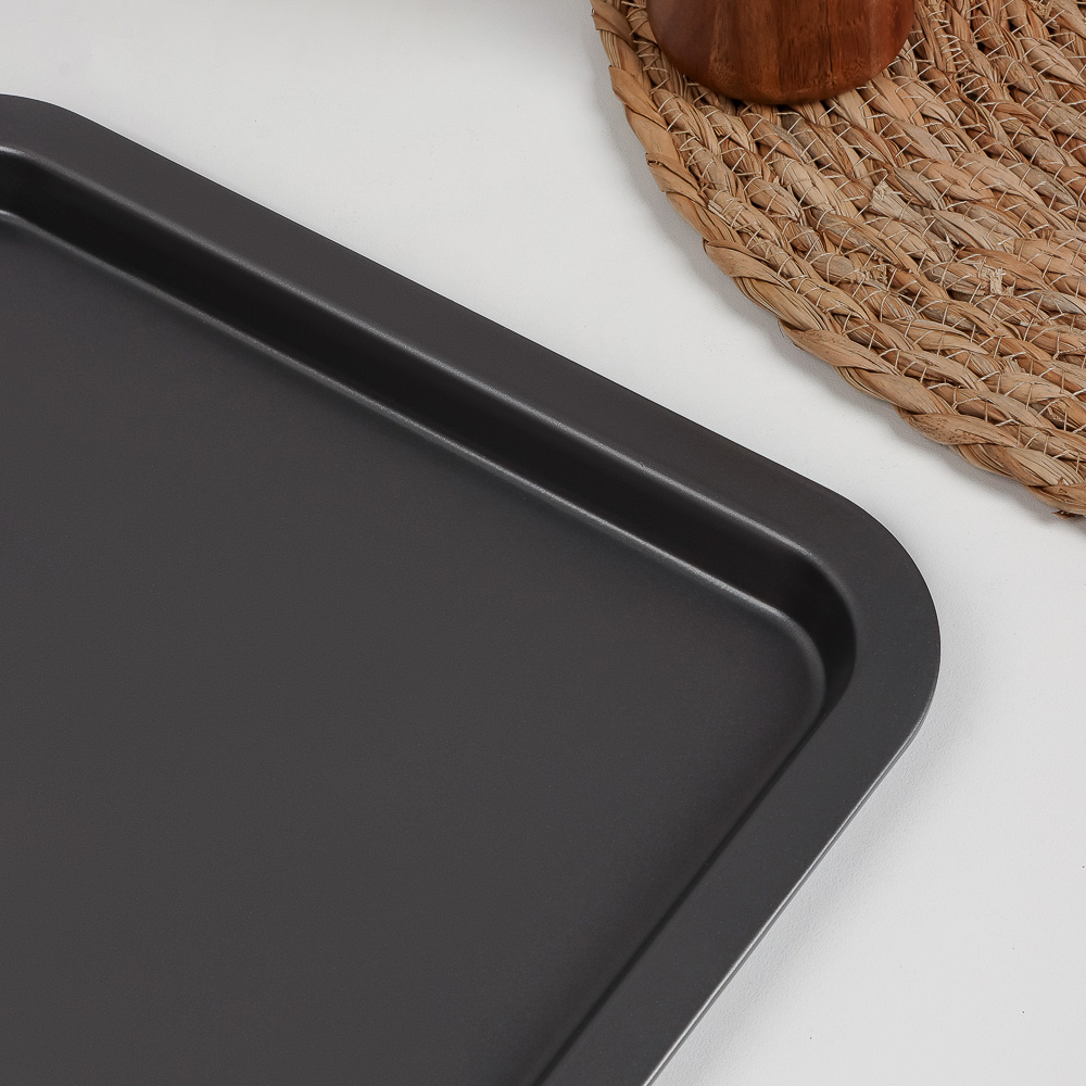 Плоский противень размером 43x29x1,8 см, выполненный из высококачественной углеродистой стали, станет вашим незаменимым помощником на кухне, идеально подходя для приготовления самых разнообразных блюд. Антипригарное покрытие обеспечивает легкость и удобство в использовании – пища не пригорает. Кроме того, это покрытие значительно упрощает процесс очистки противня. Черный цвет придаёт изделию стильный и современный вид, который прекрасно дополнит ваш кухонный интерьер. Благодаря своим размерам и плоской конструкции, противень идеально подходит для выпекания печенья, пиццы, хлеба и запеканок. Он равномерно распределяет тепло, обеспечивая идеальную текстуру и вкус готовых блюд.Плоский противень из углеродистой стали с антипригарным покрытием создан для вашего комфорта и удобства. Наслаждайтесь процессом приготовления и превосходным результатом каждый раз, когда вы используете этот качественный и надежный противень.