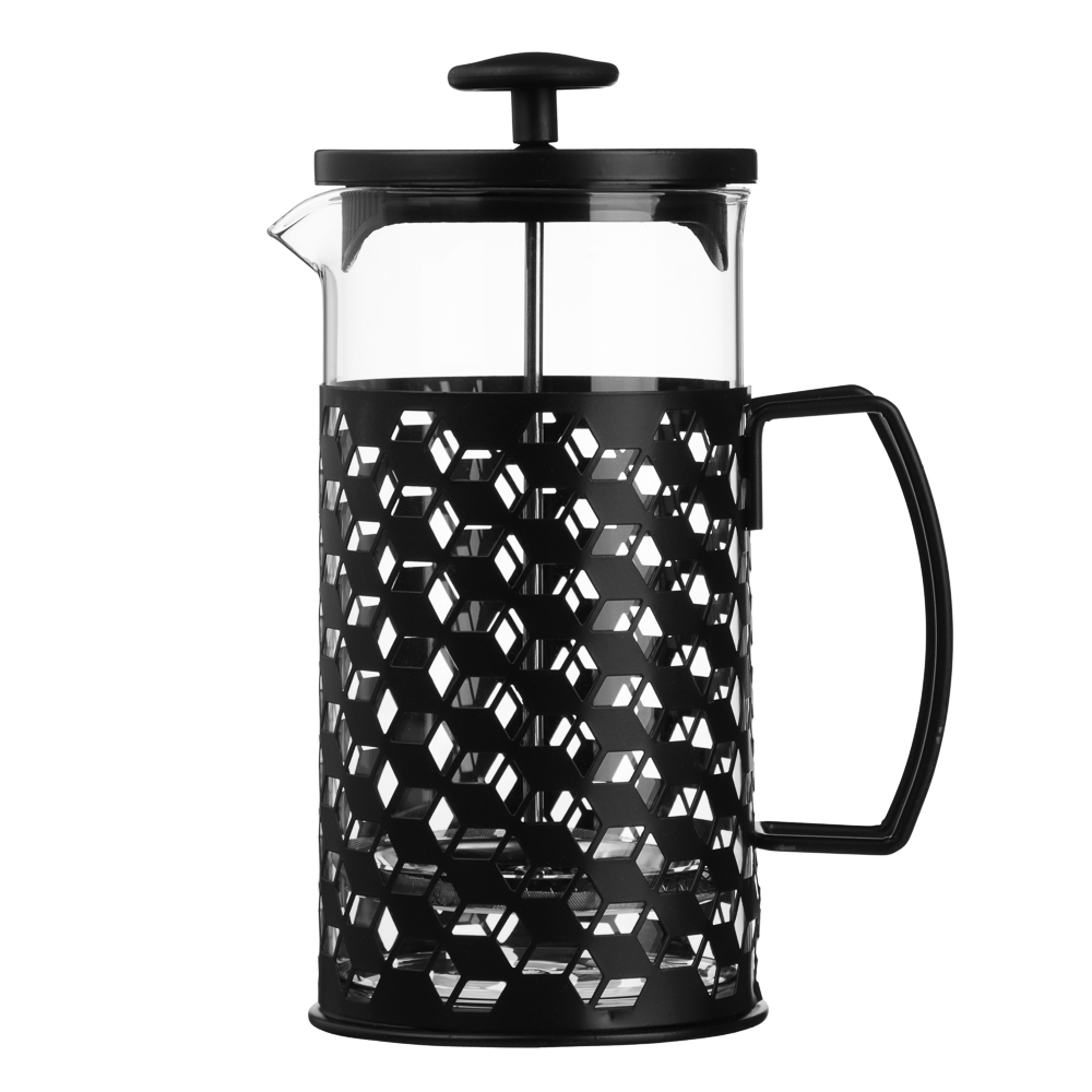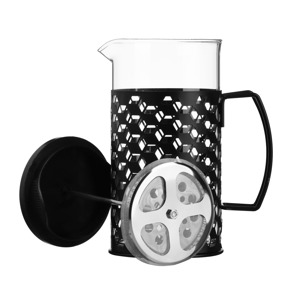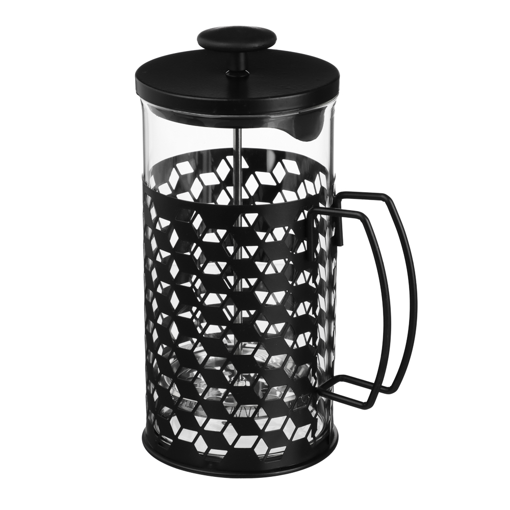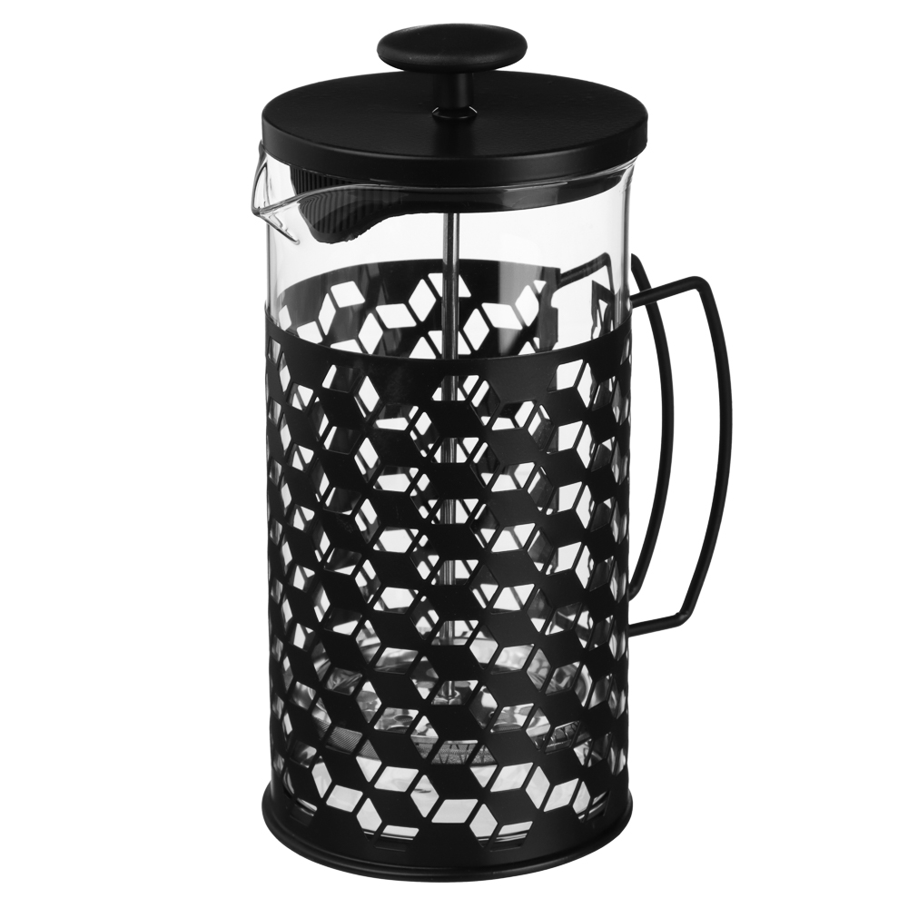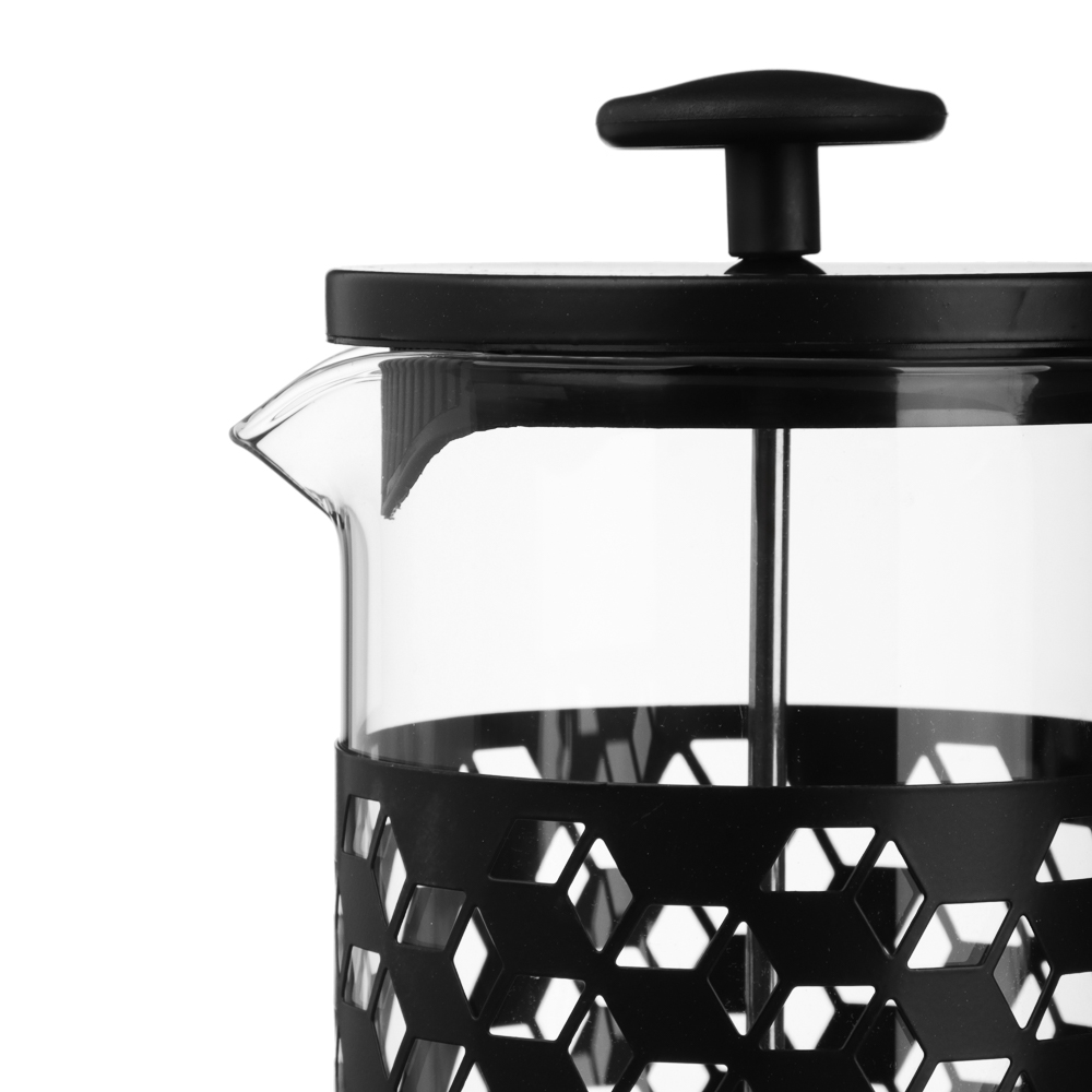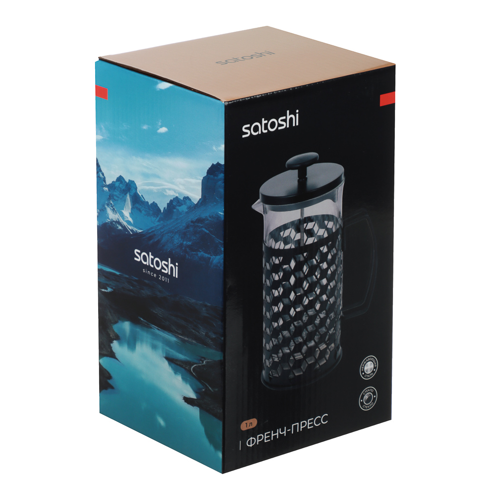 Френч-пресс SATOSHI Монблан объёмом 1 л выполнен из прочного жаропрочного стекла и нержавеющей стали с декоративным чёрным покрытием. Корпус украшен стильным геометрическим узором, который придаёт изделию современный и изысканный вид. Металлическая ручка удобной формы обеспечивает комфортное и безопасное использование. Конструкция оснащена прочным поршнем с фильтром-сеткой из нержавеющей стали, благодаря чему напиток получается чистым и ароматным, без лишних частиц. Крышка дополнительно оборудована сливным фильтром, что делает процесс приготовления кофе, чая или травяных настоев максимально удобным. Френч-пресс идеально подходит для приготовления ароматного кофе, чая и травяных настоев, сочетая в себе практичность и элегантный дизайн.