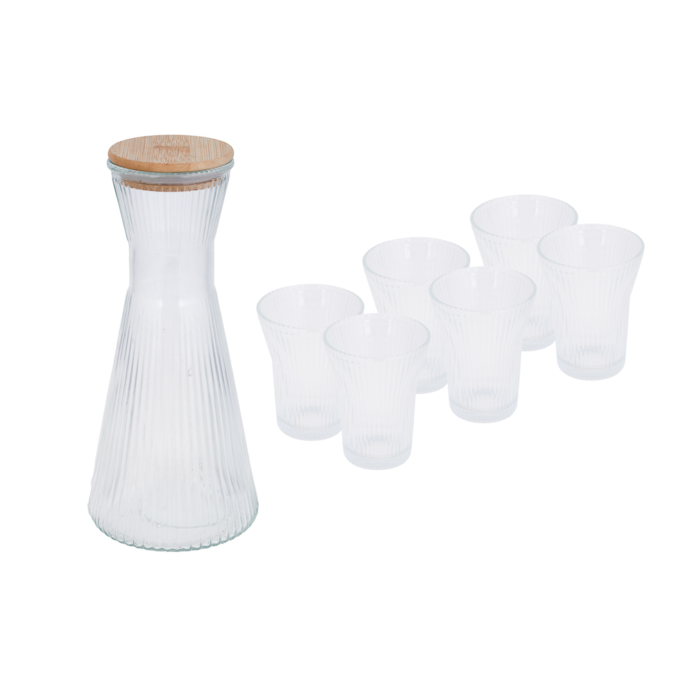 Набор SATOSHI – это стильное решение для сервировки напитков дома и на праздниках. В комплект входит элегантный кувшин объемом 1,8 л и шесть стаканов по 200 мл, выполненных из прочного стекла с рельефным узором, который красиво преломляет свет и подчеркивает прозрачность напитков. Кувшин оснащен крышкой из натурального бамбука, что придаёт набору современный и экологичный вид, а также сохраняет свежесть содержимого. Такой набор идеально подойдёт для подачи воды, сока, лимонада или холодного чая, создавая атмосферу уюта и стиля за любым столом.