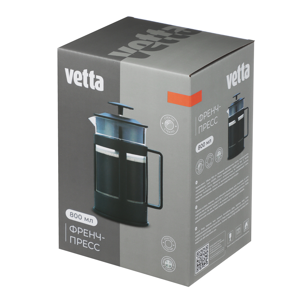 Френч-пресс VETTA "Мелана" 800 мл — идеальное решение для ценителей насыщенного кофе. Объём 800 мл рассчитан на 3-4 порции, что делает его отличным выбором для семьи или небольшой компании. Колба из жаропрочного стекла устойчива к термическим нагрузкам и выдерживает нагрев до 200°C, сохраняя тепло и аромат напитка. Фильтр-поршень из нержавеющей стали обеспечивает герметичное прилегание и эффективное отделение кофейной гущи. Устройство легко разбирается и моется в посудомоечной машине. Эргономичный дизайн сочетает в себе лаконичность и практичность для ежедневного использования.
