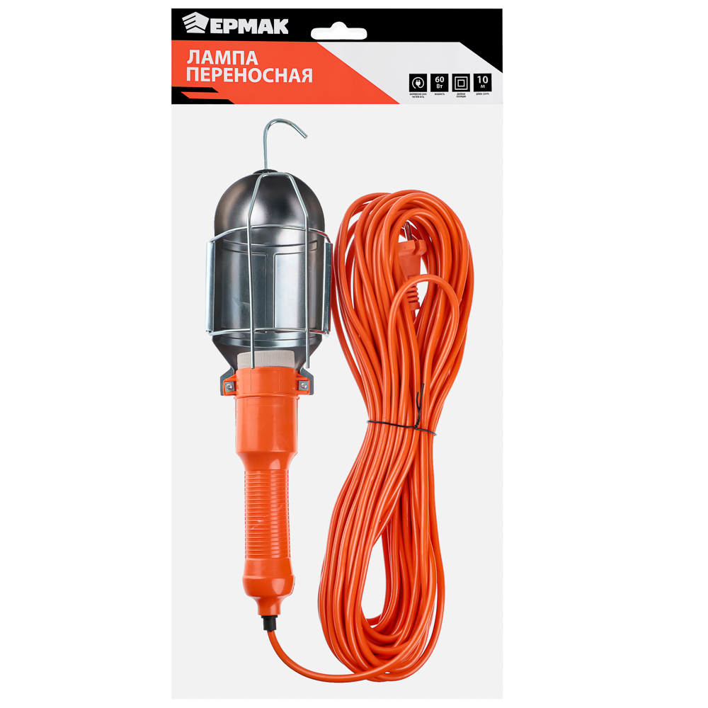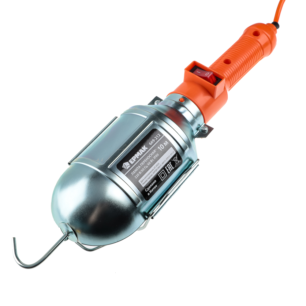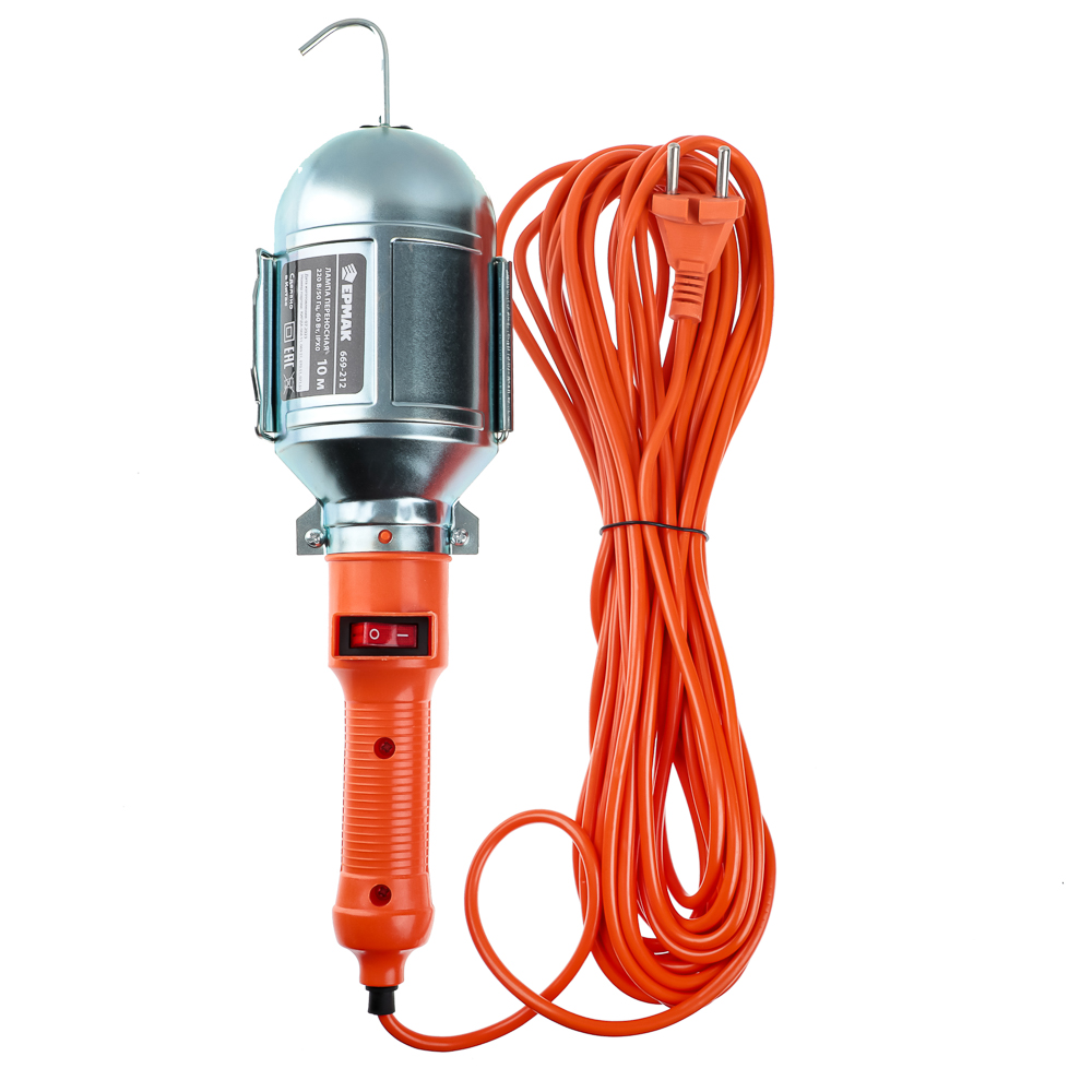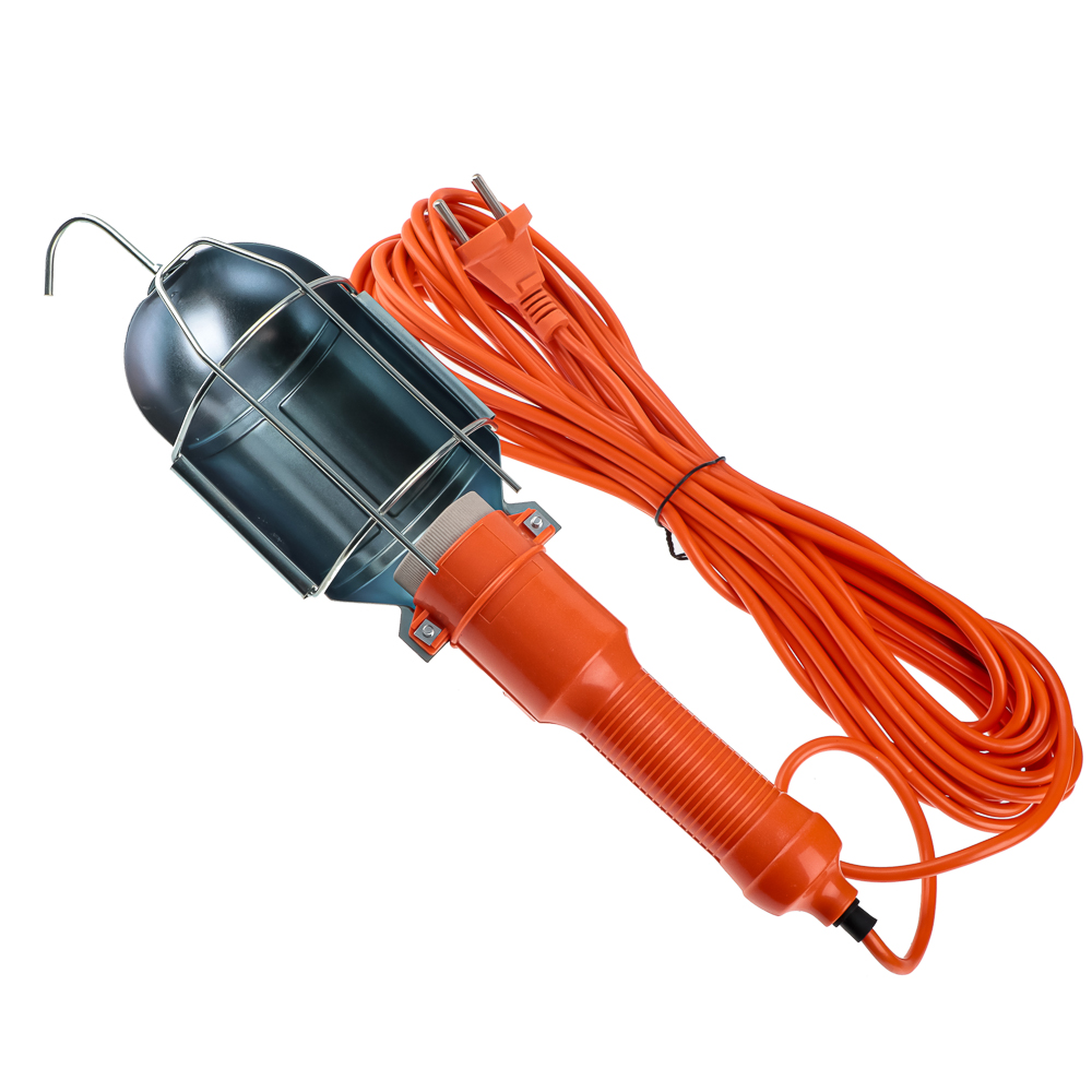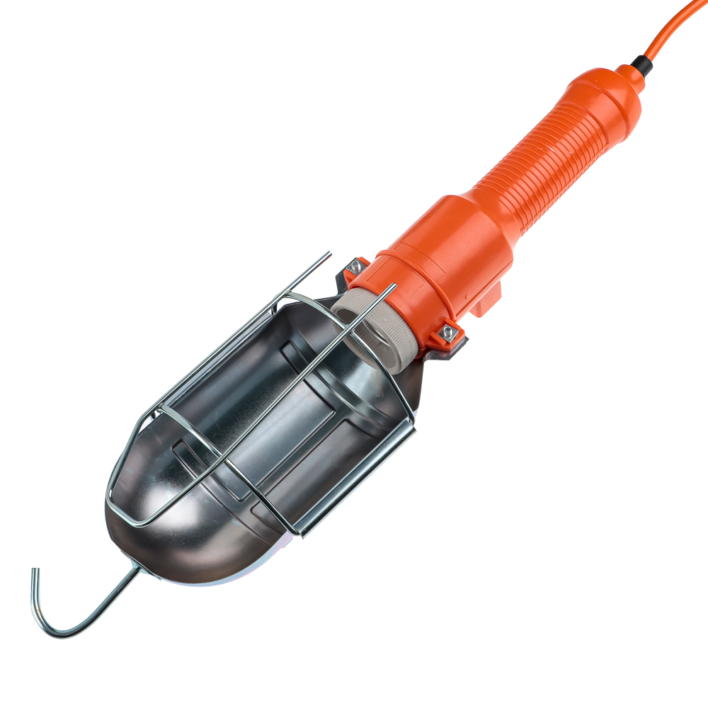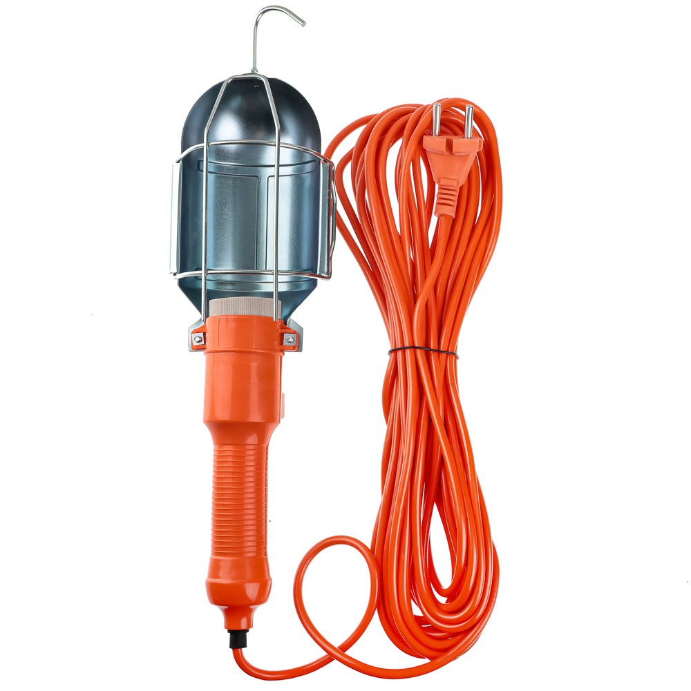 Переносная лампа. Удобна на стройке, когда делают ремонт, в автомастерских. Длина кабеля 10 метров. Выключатель на ручке - не нужно идти к розетке, чтобы выключить лампу. Ручка пластиковая. Лампочка защищена металлическим кожухом с крупной решеткой - предотвращает удары и не мешает свету. Мощность 60 Вт. С крюком, чтобы подвешивать лампу.