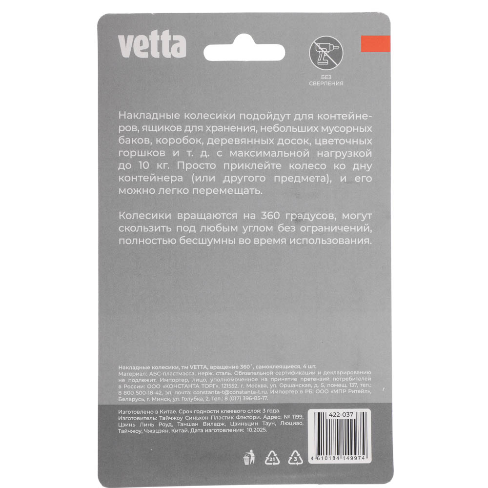 Накладные колесики VETTA предназначены для разнообразных домашних контейнеров, коробок, ящиков, ведер, небольших мусорных баков, деревянных досок, цветочных горшков и т.д. Теперь не нужно выдвигать и царапать поверхность пола или полки. Просто приклейте колесо ко дну контейнера (или другого предмета), и его можно легко перемещать! Особенности: вращение 360 градусов. Максимальная нагрузка до 10 кг. В наборе 4 шт.