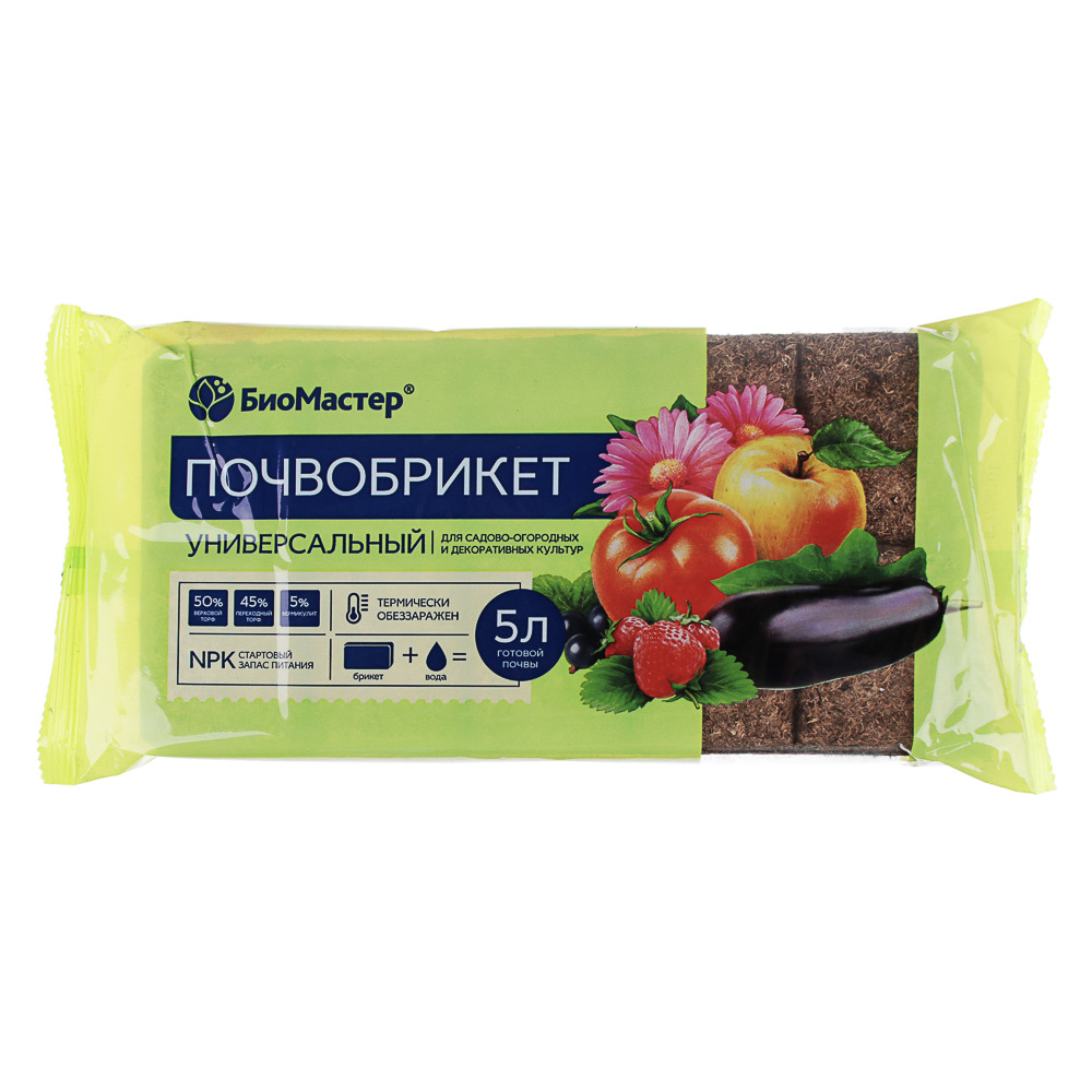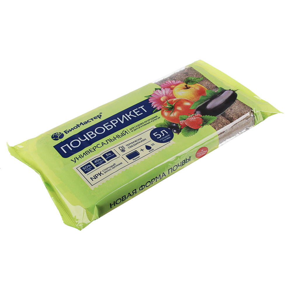 Почвобрикет БиоМастер – экологически чистая прессованная почва на основе высококачественных торфов с добавлением питательных веществ, идеально подходит для всех видов растений, а также для улучшения почвы на грядках в саду и теплицах. Достаточно добавить воды к почвобрикету – и через 5-8 минут почва готова к использованию. Почва однородная, мягкая, с высокой влагоемкостью и воздухопроницаемостью, отличными дренажными свойствами. Почва содержит стартовый запас питательных элементов для роста здоровых, крепких растений. Состав: торф верховой нейтрализованный; переходный торф: вермикулит; удобрение нитроаммофоска (азофоска) марки РК: 16-16-16, 13-13-24. Содержание доступных для растений питательных элементов (мг/л), не менее: азот (NH, +NO) 170; фосфор (Р.О.) 160; калий (К,0) 250; микроэлементы: Ре; Mo; B; Znc Mi; Cu. pH-5,5-6,8. Массовая доля влаги не более 20%.