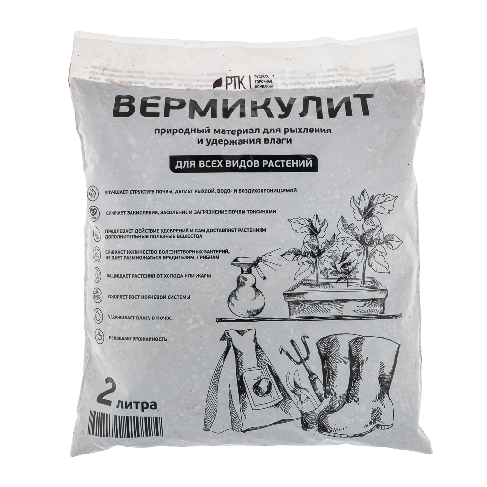 Вермикулит – разрыхлитель тяжелых грунтов, а также влагосорбент для всех типов почв (повышает обменную влагоемкость). Вермикулит имеет долгий срок действия - в открытом грунте сохраняет эффективность до 10 лет. Он способен нейтрализовать избыточную кислотность, сохраняя субстрат плодородным. Вермикулит обладает низкой теплопроводностью, что защищает молодые корни от замерзания во время заморозков. Его используют для выращивания рассады, черенкования, выращивания травянистых растений и выращивания горшечных методом сухой гидропоники.Способ применения и нормы внесения:1. Как дренаж для горшечных растений: насыпать на дно горшка слоем 3-5 см в зависимости от размера емкости, сверху присыпать грунтом. Затем посадить растение. 2. Как компонент земляной смеси: смешать добавку с грунтом в соотношении 1:3. При подготовке цветочного грунта добавить вермикулит к грунту в соотношении 2:10 и перемешать.3. Как субстрат для проращивания семян: вермикулит увлажнить, засыпать в посадочные ем