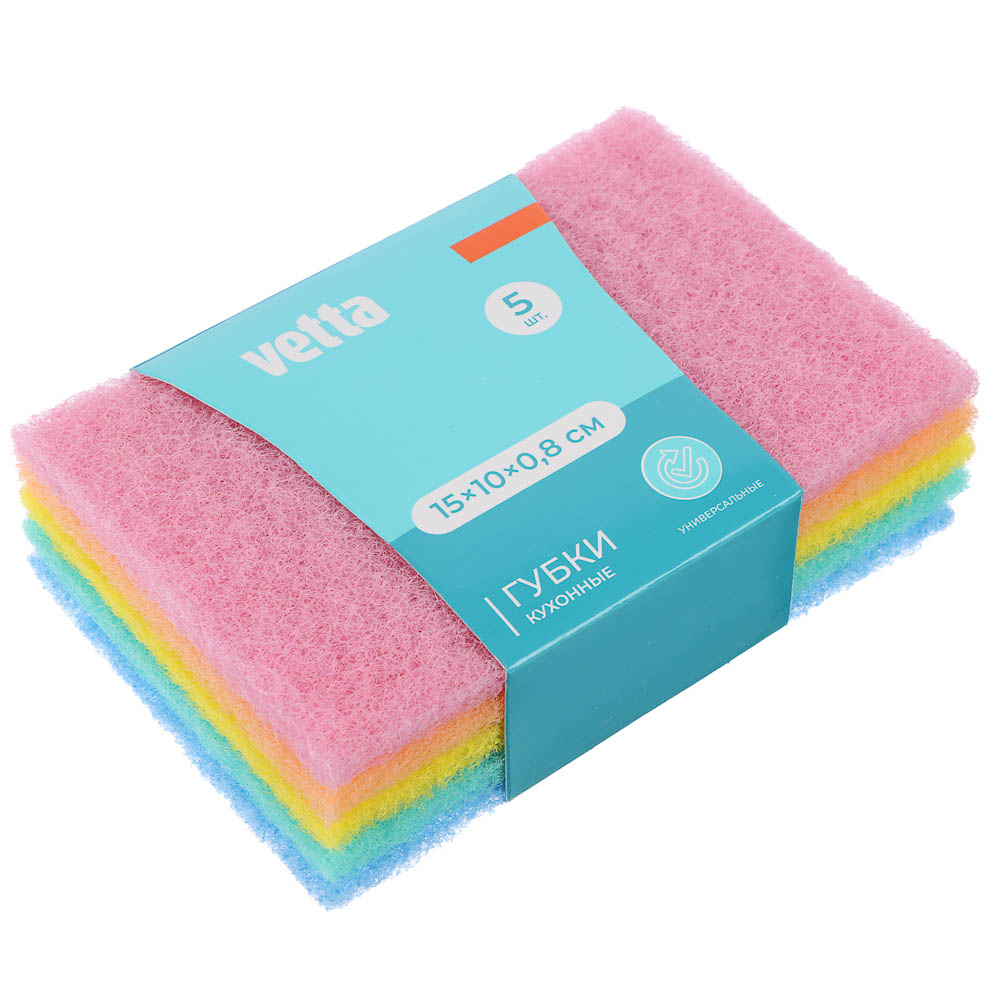 Комплект из 5 практичных губок для мытья посуды от ТМ VETTA — идеальное сочетание качества, удобства и долговечности. Изготовленные из прочного полипропиленового материала, губки обладают отличной впитывающей способностью и мягкой текстурой, которая бережно справляется с загрязнениями, сохраняя поверхность посуды и бытовой техники без царапин. Губки универсальны в применении: подходят как для мытья тарелок, кастрюль и сковород, так и для очистки кухонных поверхностей, раковины, плитки и других бытовых предметов. Оптимальный размер 15×10×0,8 см обеспечивает удобный захват и комфорт в использовании.