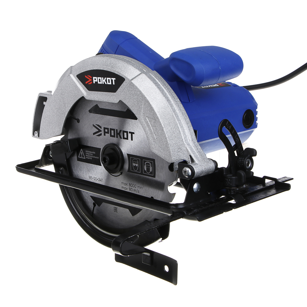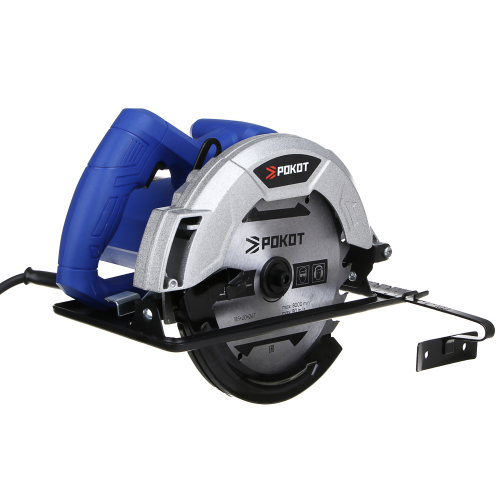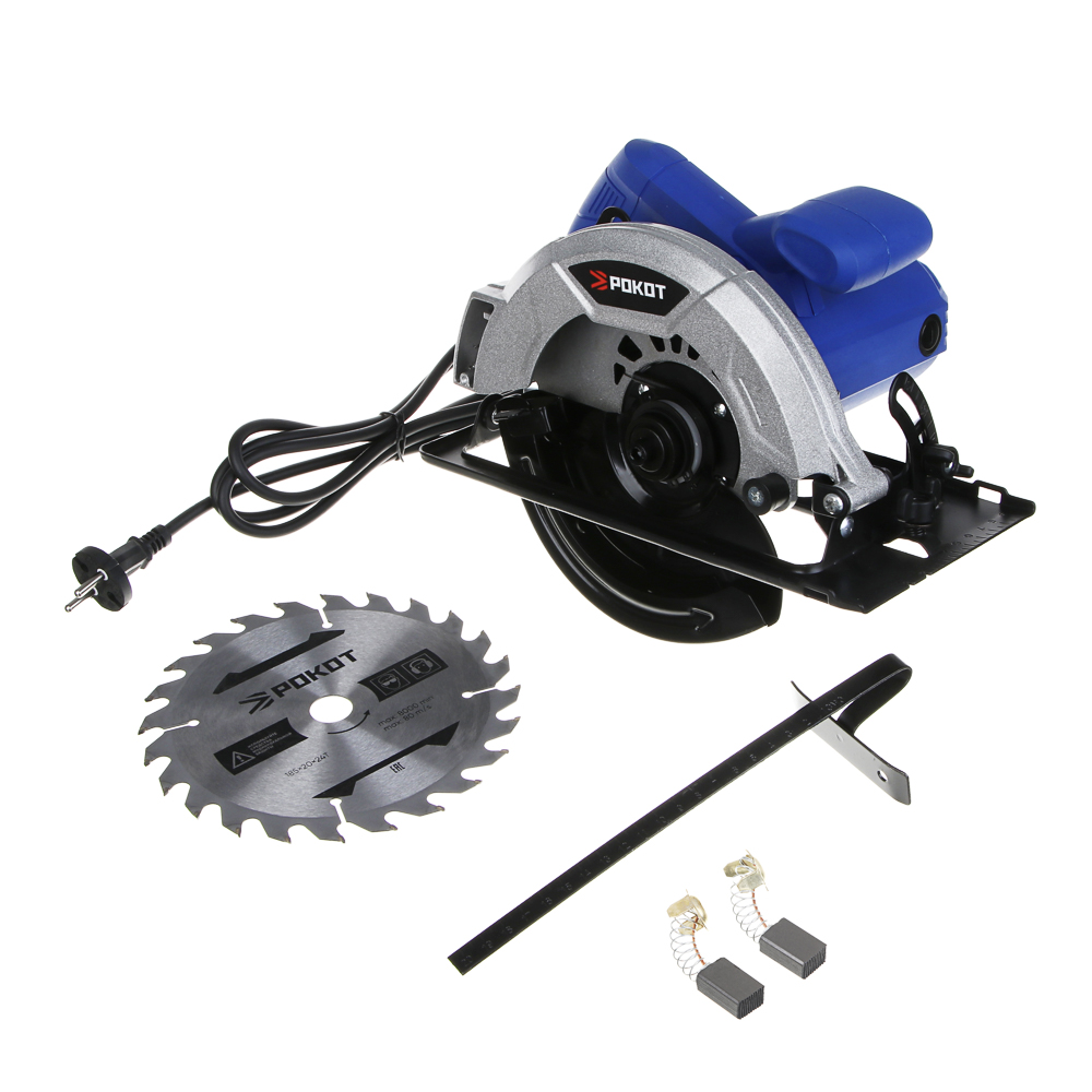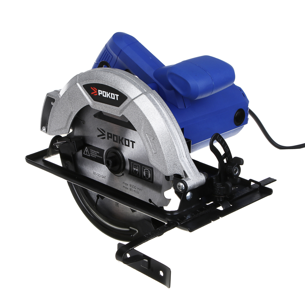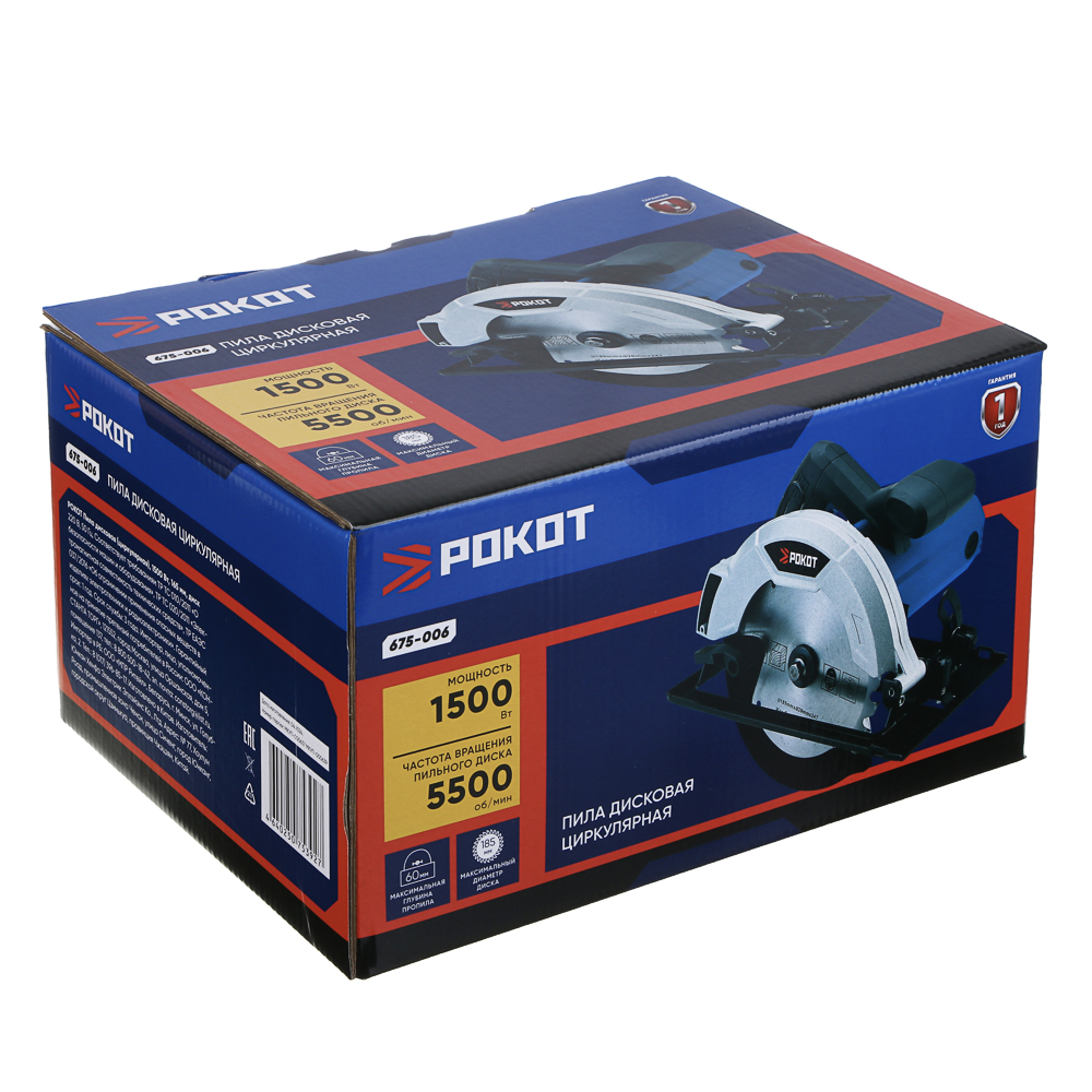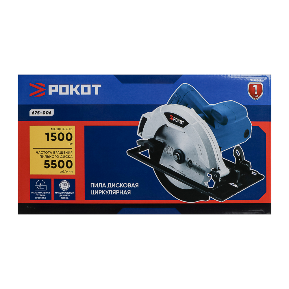 Циркулярная дисковая пила РОКОТ мощностью 1500 Вт с диском на 185 мм предназначена для резки древесины, включая брус, ДСП, фанеру, а также для пластика, гипсокартона, ламината. Частота вращения пильного диска – 5500 об./мин. Максимальная глубина пропила – 60 мм. Конструкцией предусмотрен защитный кожух для безопасного использования инструмента, а рукоять имеет эргономичную форму для комфортного хвата. Работает от электросети.