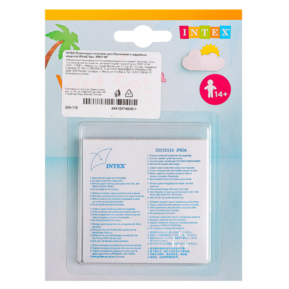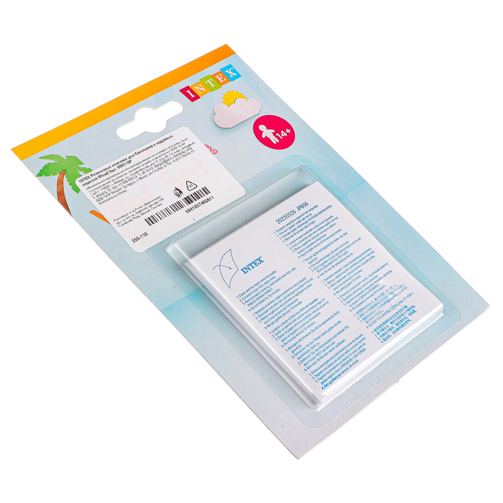 Ремонтный комплект для бассейнов и надувных изделий INTEX. Подходит для реставрации любых надувных изделий: матрасов, игрушек, подушек, надувной мебели. Если дети на даче прокололи бассейн, вы быстро его почините. Использовать комплект просто: в упаковке 6 самоклеящихся заплаток, зачистите место прокола и заклейте готовой заплаткой.