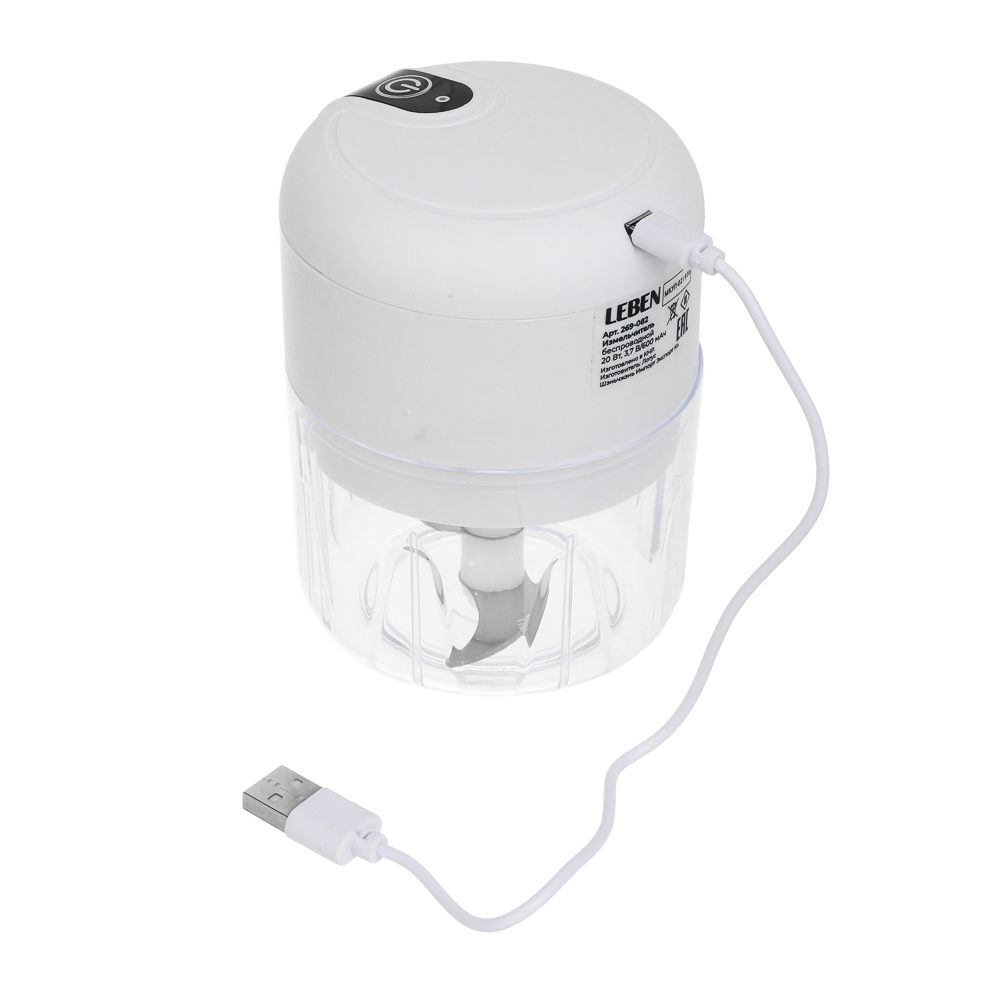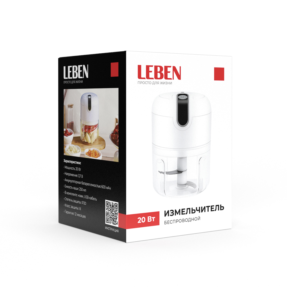 Мини-измельчитель LEBEN беспроводной — компактный и мощный кухонный помощник для быстрого измельчения зелени, орехов, чеснока, лука и других небольших продуктов. Благодаря беспроводной конструкции и удобному размеру он идеально подходит для использования на маленькой кухне, даче или в путешествии. Мощность устройства составляет 20 Вт, что обеспечивает эффективное измельчение даже твёрдых продуктов. Объём чаши — 250 мл, выполнен из нержавеющей стали, что гарантирует долговечность и гигиеничность. Встроенный аккумулятор ёмкостью 600 мАч позволяет работать без проводов до 30 секунд на одном заряде, а зарядка через USB делает использование максимально удобным. Корпус из качественного пластика и нержавеющей стали легко моется и устойчив к воздействию влаги. Устройство имеет класс защиты IP20, что обеспечивает безопасность при эксплуатации. Стильный белый цвет и эргономичный дизайн делают этот измельчитель не только функциональным, но и эстетичным дополнением вашей кухни.