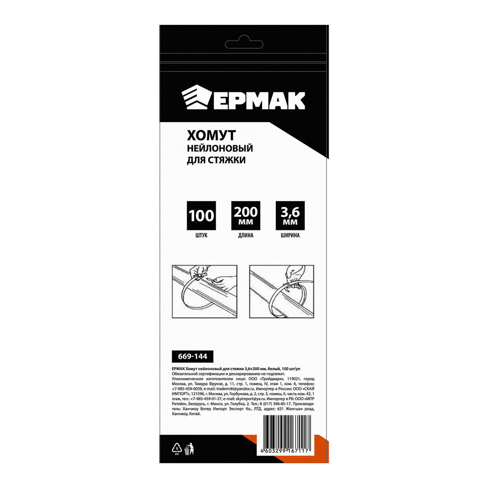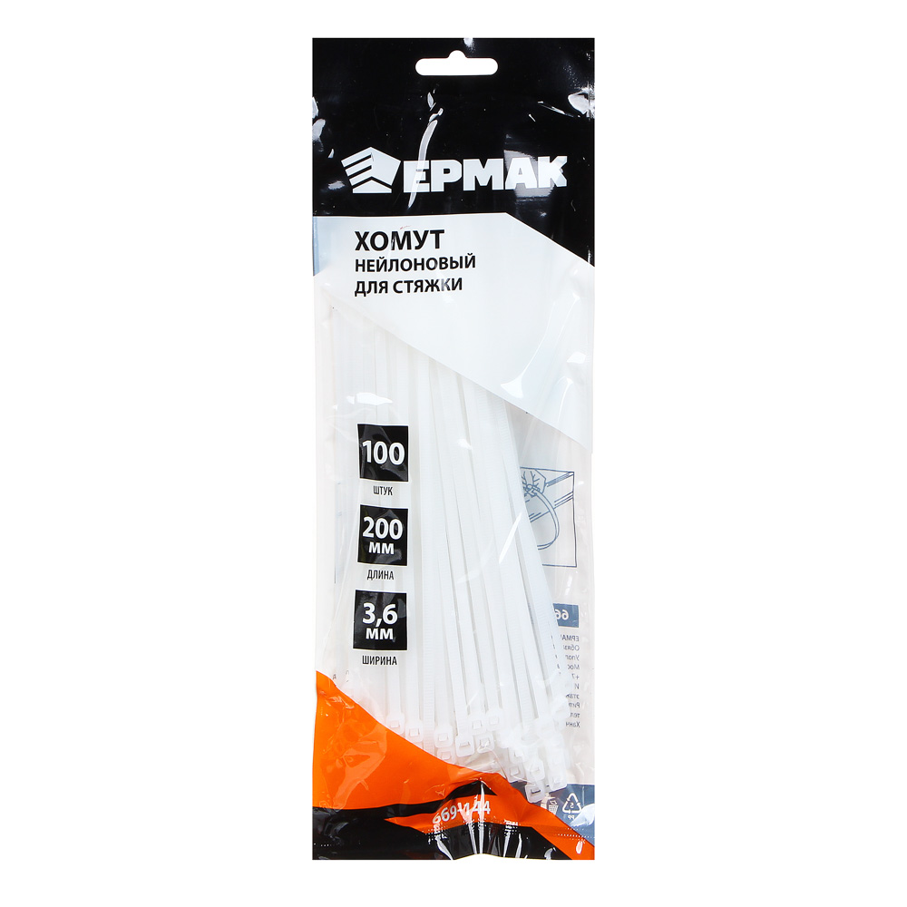 Нейлоновый хомут для стяжки ЕРМАК 3,6х200 мм белого цвета используется для фиксации, стяжки и крепления кабелей, проводов, шлангов в пучок во время монтажа электропроводки, а также для бытовых целей. Хомут прочный, долговечный, устойчив к растяжению, растрескиванию и деформации, не плесневеет. Имеет надежный замок с блокировкой. 100 штук в упаковке.
