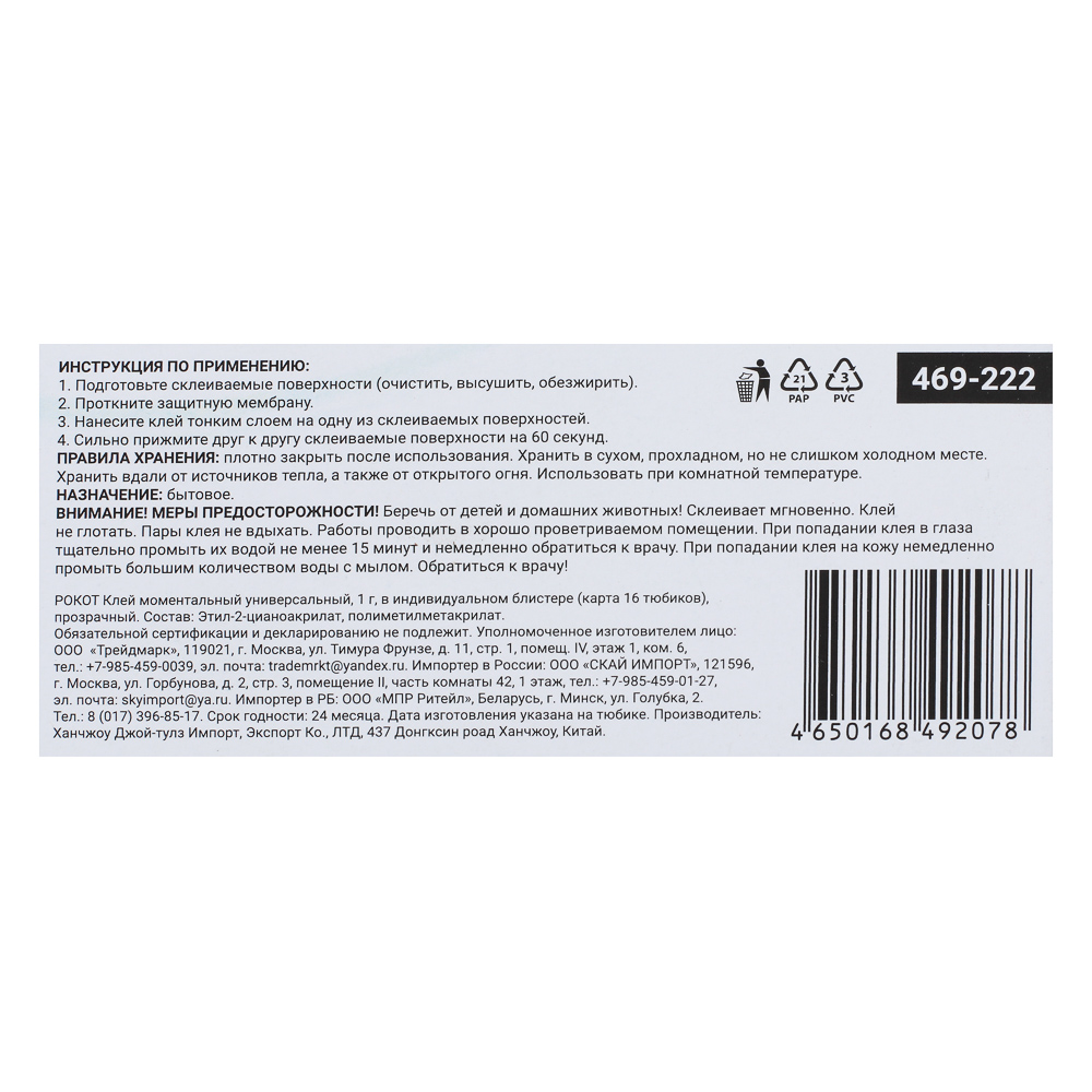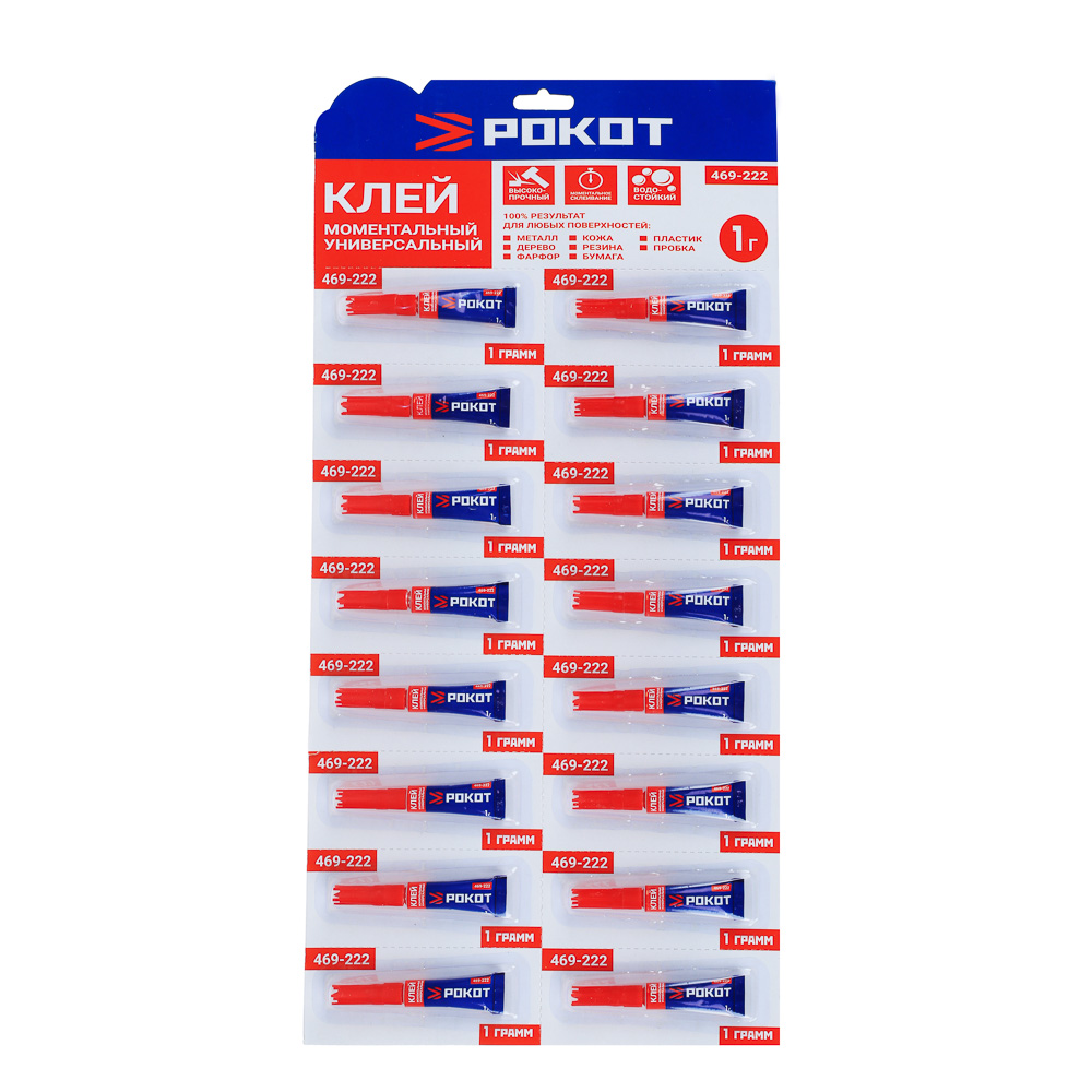 Универсальный моментальный клей РОКОТ является быстрым и надежным решением для бытовых задач и ремонта. Клей не имеет цвета и отлично подходит для склеивания поверхностей из различных материалов. В тюбике 1 г средства.
