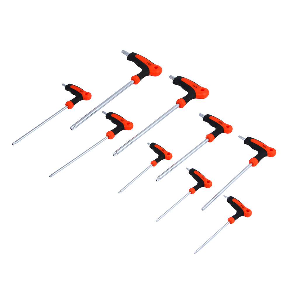 Набор шестигранных ключей предназначены для работы с крепежом, оснащенным шлицем TORX (звездочкой). Ключи имеют Т-образную форму, изготовлены из высококачественной хромованадиевой стали твердостью 50 HRC. В наборе 9шт предметов.