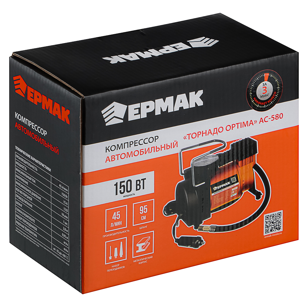 Автомобильный компрессор АС-580 OPTIMA тм ЕРМАК — современное и надежное устройство для накачки шин автомобилей, мотоциклов, велосипедов и других надувных изделий. Он сочетает компактные размеры, высокую производительность и удобство использования в дороге или дома. Модель оснащена мощным роторным двигателем мощностью 150 Вт, обеспечивающим стабильную работу и эффективность при накачке шин. Производительность компрессора составляет 45 л/мин, что позволяет быстро достигать необходимого давления, экономя время и усилия. Устройство подключается к прикуривателю автомобиля, что делает его мобильным и удобным для использования в любых условиях.