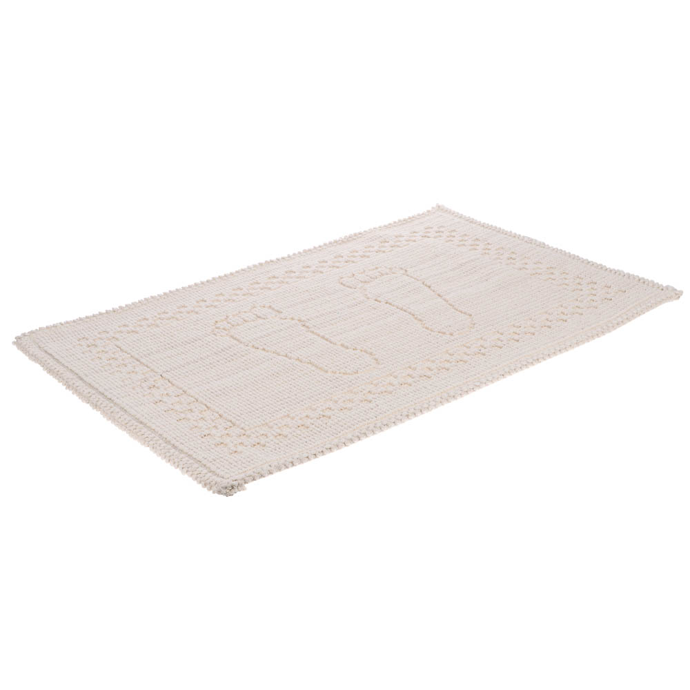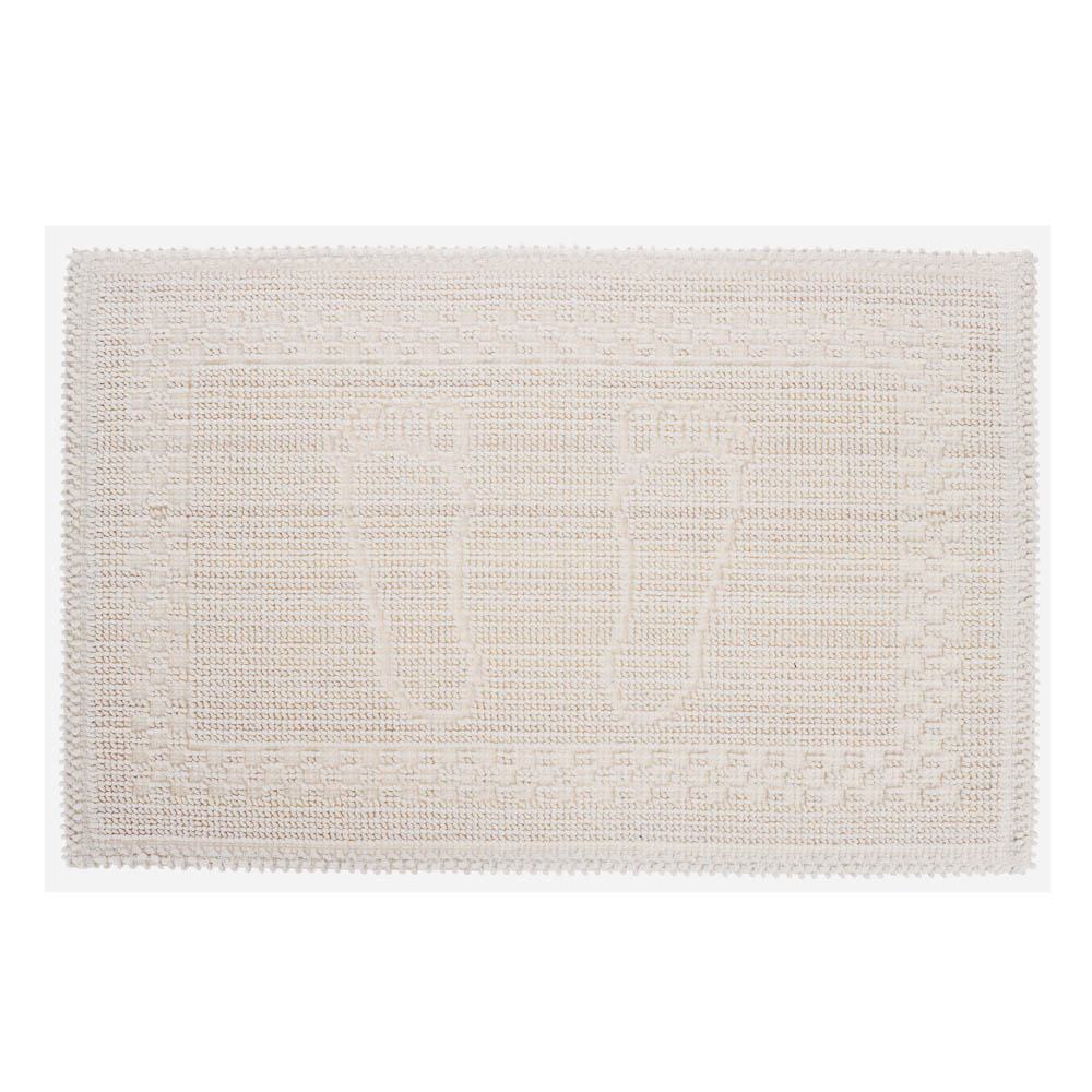Петельный коврик из хлопка размером 60×40 см предназначен для использования в ванной комнате и обеспечивает комфорт после водных процедур. Одинарная петельная структура хорошо впитывает влагу, помогая сохранять пол сухим и чистым. Прямоугольная форма и нейтральный цвет экрю гармонично вписываются в интерьер ванной, а оригинальный дизайн с рисунком ног добавляет уюта и визуального акцента. Натуральный хлопок приятен на ощупь, мягкий и безопасный для ежедневного использования. Коврик прост в уходе, устойчив к регулярной стирке и подходит для размещения у ванны, душевой кабины или раковины, сочетая практичность и декоративную привлекательность.