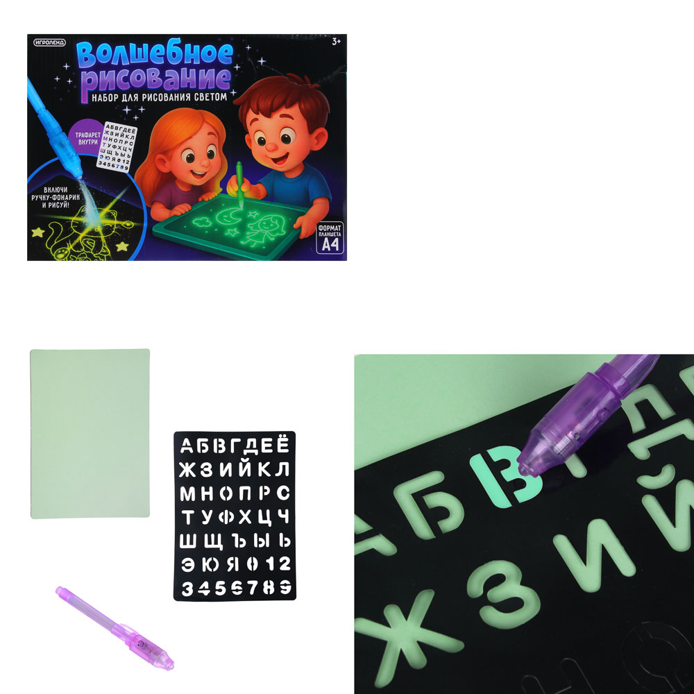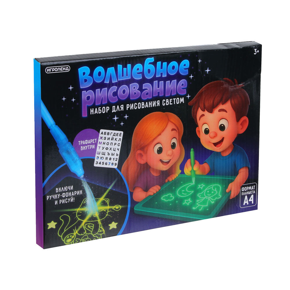 Набор для рисования светом "Волшебное рисование" от ИГРОЛЕНД откроет таинственный мир волшебства и магии и очарует вашего малыша! В набор входит ручка для рисования светом, планшет формата A4, трафарет с алфавитом и цифрами А4 и инструкция. Процесс рисования осуществляется в темноте, а из-под световой ручки появляются изумительные яркие светящиеся рисунки, которые юный художник сможет придумывать самостоятельно, а также использовать трафарет для знакомства с алфавитом. Творческий процесс поможет ребенку расслабиться и подготовиться ко сну, а также преодолеть страх темноты. Питание ручки осуществляется от 3-х батареек AG3. Для детей старше 3-х лет.