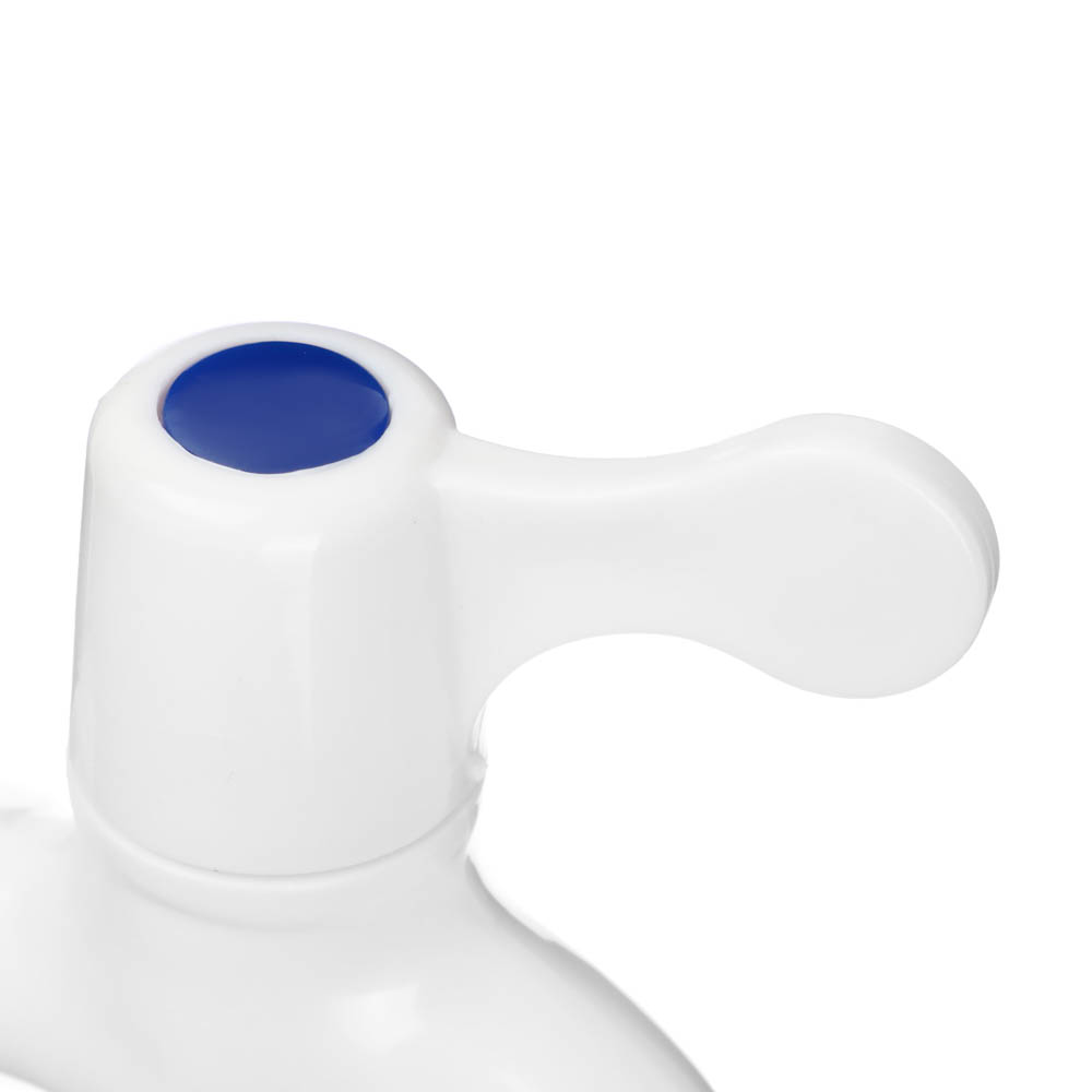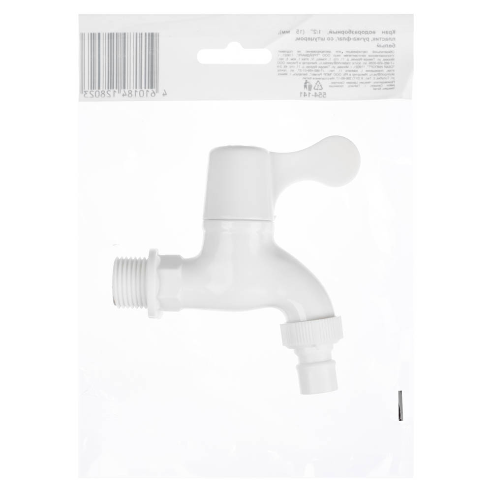 Водоразборный кран 1/2" (15 мм) белого цвета из полипропилена для горячей воды со штуцером используется для хозяйственных и бытовых нужд в доме или на даче. Имеет прочную конструкцию, устойчив к гидроударам, характеризуется низким уровнем шума, не ржавеет и легко моется. Ручка-флаг обеспечивает удобство во время регулировки напора и закрытия крана.