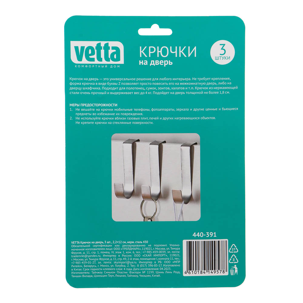Представляем набор из трех крючков VETTA, которые станут настоящим спасением для любого дома или офиса. Изготовленные из высококачественной нержавеющей стали 430, эти крючки обладают повышенной прочностью и долговечностью. Они идеально подойдут для организации пространства: на них можно вешать одежду, полотенца, ключи и множество других вещей. Размер крючков - 2,2х12см, что позволяет устанавливать их на любые двери. Крючки легко крепятся и не оставляют следов. Сделайте свое пространство удобнее с крючками VETTA!
