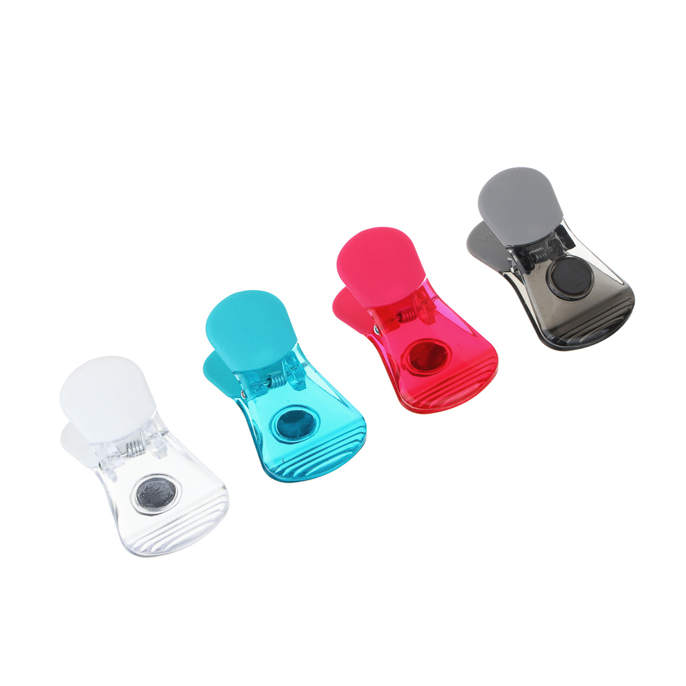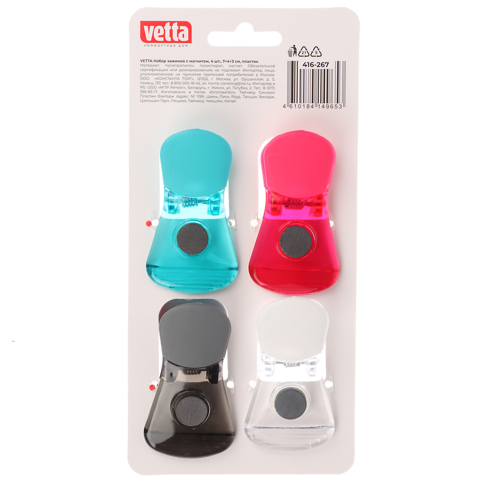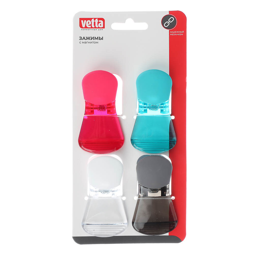 Набор зажимов VETTA - это универсальный помощник на вашей кухне! В комплект входит 4 мощных зажима размером 7х4х3см, изготовленных из качественного пластика. Благодаря встроенным магнитам, их можно прикрепить к любой металлической поверхности, например, холодильнику - так ваши зажимы всегда будут под рукой. Идеально подходят для герметичного закрытия пакетов с продуктами, благодаря чему ваша еда останется свежей намного дольше. Эргономичный дизайн и яркие цвета сделают использование зажимов VETTA удобным и приятным. Порадуйте себя практичным и стильным аксессуаром на кухне!