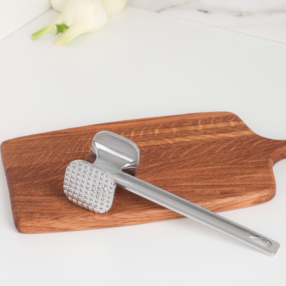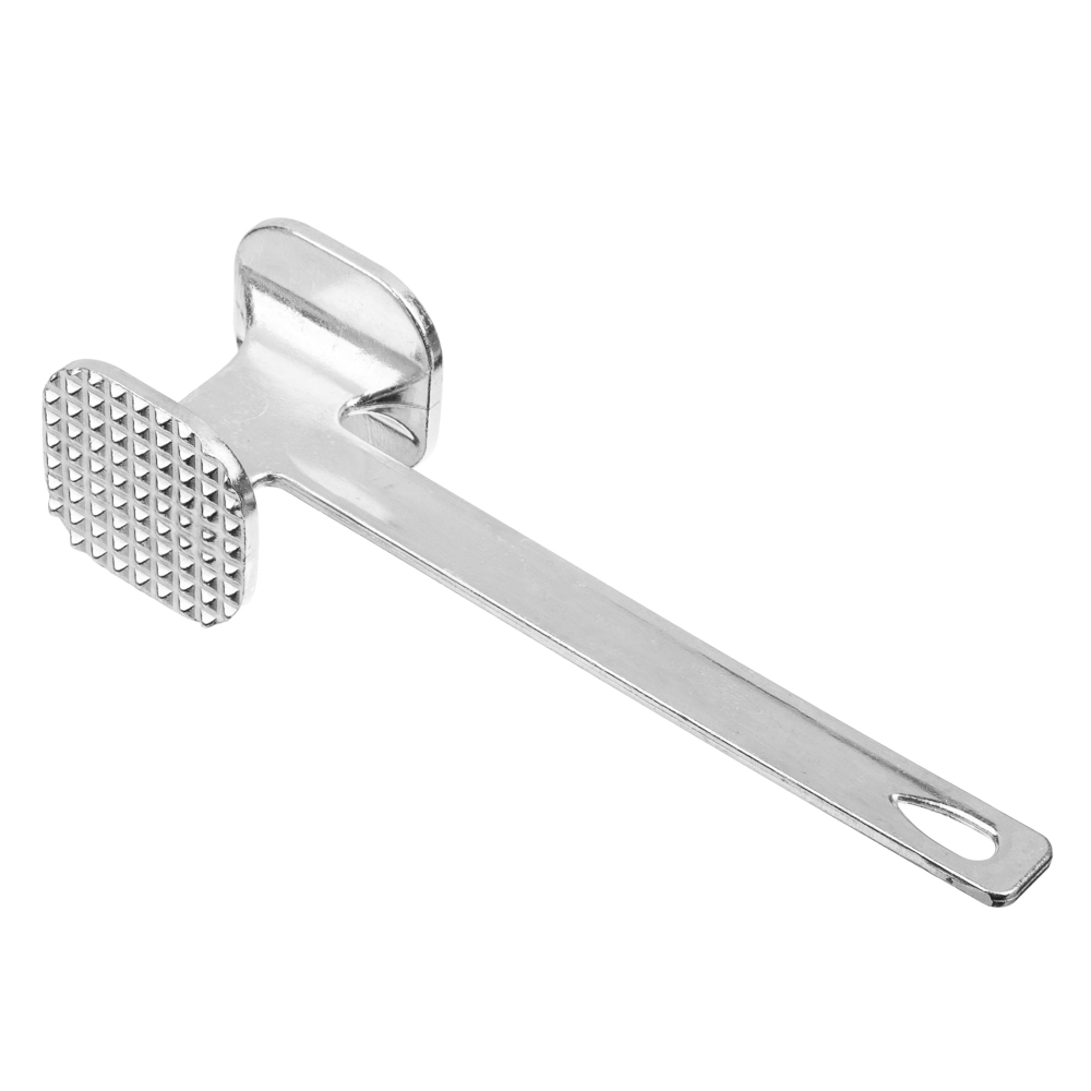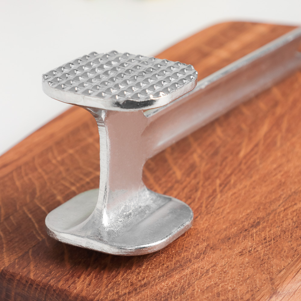 Молоток имеет удобную ручку с правильным распределением центра тяжести и отверстием для подвешивания. Одна ребристая сторона молотка предназначена для отбивания, чтобы сделать мясо мягким и нежным, а другая сторона плоская - для уплощения фактуры. Кухонный молоток - удобный кухонный аксессуар, верный помощник хозяйки на кухне, позволяет без особых усилий приготовить полуфабрикат для отбивных или бифштекса.
