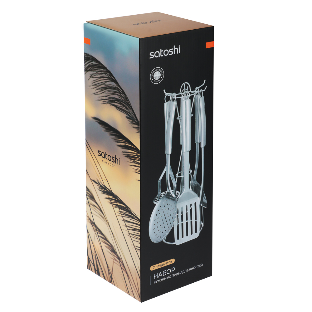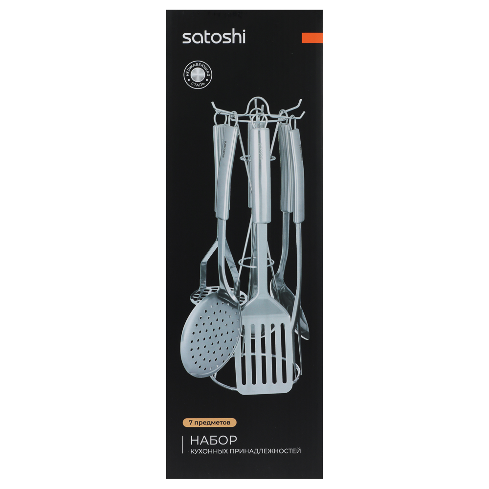 Набор кухонных принадлежностей из нержавеющей стали SATOSHI АЛЬФА включает 7 предметов, которые ежедневно необходимы каждой хозяйке: половник, сервировочную ложку, картофелемялку, шумовку, вилку транжирную для мяса и лопатку с отверстиями. Комплект также оснащен удобной устойчивой подставкой с крючками, которая позволяет хранить все приборы, занимая минимум пространства. Набор имеет современный дизайн и будет красиво смотреться на любой кухне.