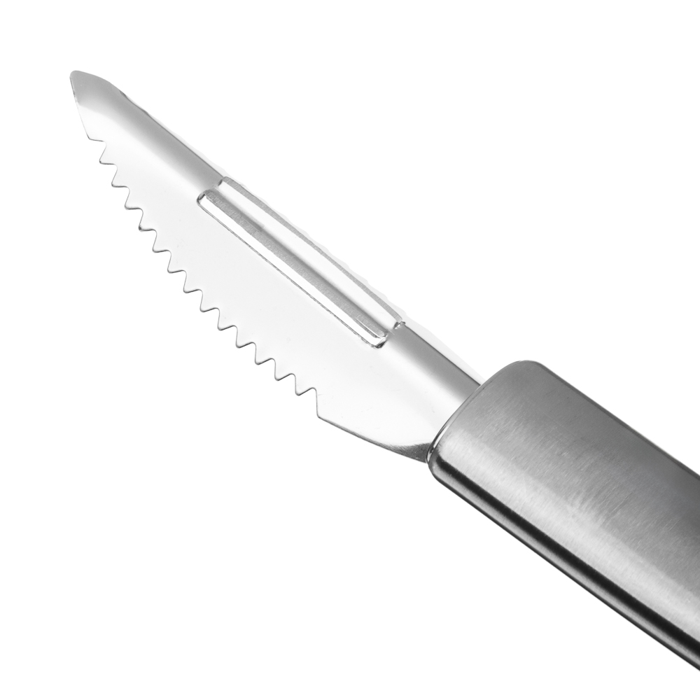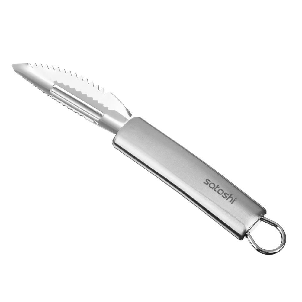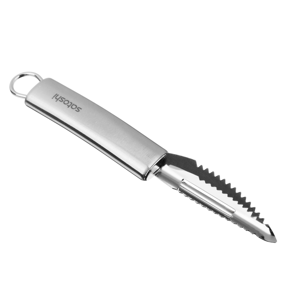 Овощечистка SATOSHI Альфа вертикальная — лучший помощник для очистки продолговатых овощей от кожуры. С таким аксессуаром вам не составит труда очистить морковь, огурцы, кабачки и баклажаны. Инструмент срезает тонкий слой кожуры, оставляя в овощах максимум витаминов и полезных вещей. Материал не боится ржавчины, не окисляется и надолго сохраняет остроту.