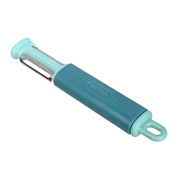 Данная вертикальная ручная фрукто-овощечистка — простой прибор, необходимый на каждой кухне, так как инструмент подходят практически для любых продуктов и минимизирует отходы от очистки овощей и фруктов. Овощечистка имеет яркий дизайн, компактный размер, а так же состоит из нескользящей ручки и двух лезвий , которые немного выступает над поверхностью. Лезвия острое и не нуждается в частой заточке. Инструмент долгое время эффективно справляется с поставленными задачами. Эта модель напоминает классический нож. Такое строение упрощает очистку овощей и фруктов. Она очищает от кожуры даже в труднодоступных местах. Приборы с зубчатым лезвием лучше использовать при работе с мягкими овощами, а с ровным — с твердыми. Рабочая часть заточена с обеих сторон, а это значит, что инструмент работает с любой позиции и под любым углом. Достоинство фрукто-овощечисток — безопасность. Ими невозможно порезаться в отличие от стандартных ножей.
